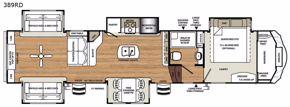 This rear entertainment living room layout Sandpiper fifth wheel is perfect for those who enjoy having guests over even while away from home. Model 389RD by Forest River offers ample space for family and friends to join you and even spend the night if you wish!