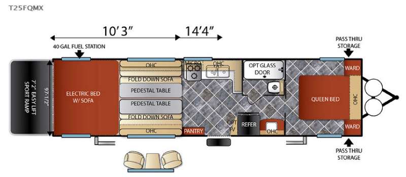 As you enter via the rear easy lift sport ramp, there is an electric bed and a sofa at the rear of this toy hauler. Continuing forward, there is a fold down sofa, a pedestal table, and overhead cabinets along each side wall. You may choose the option of two swivel chairs with a center table along the curb side in place of the sofa and table.