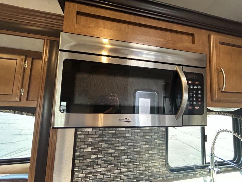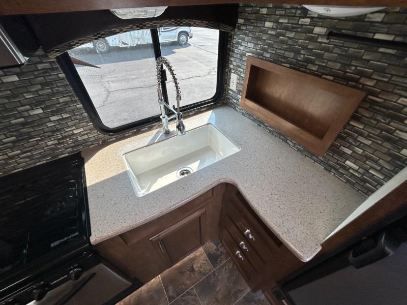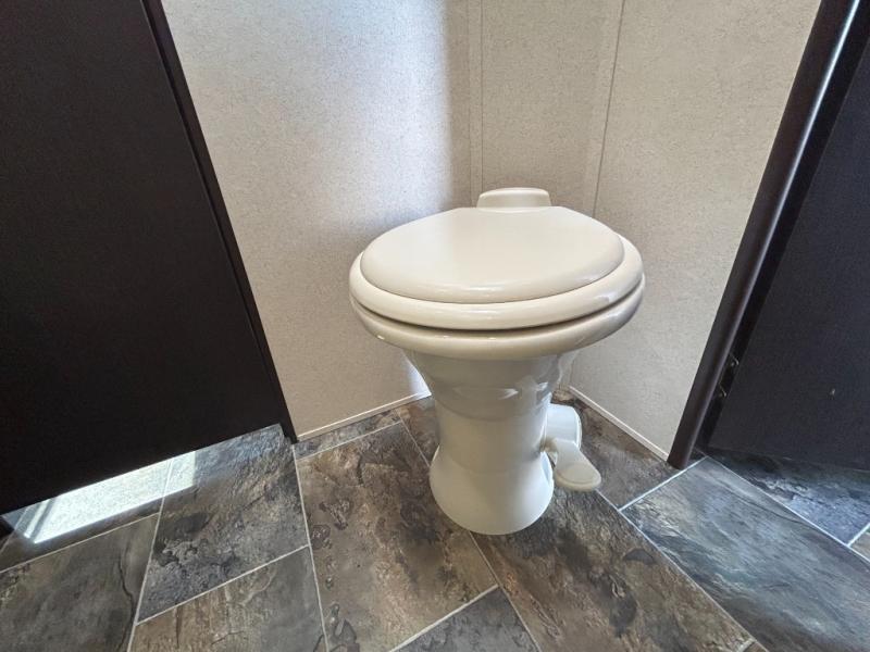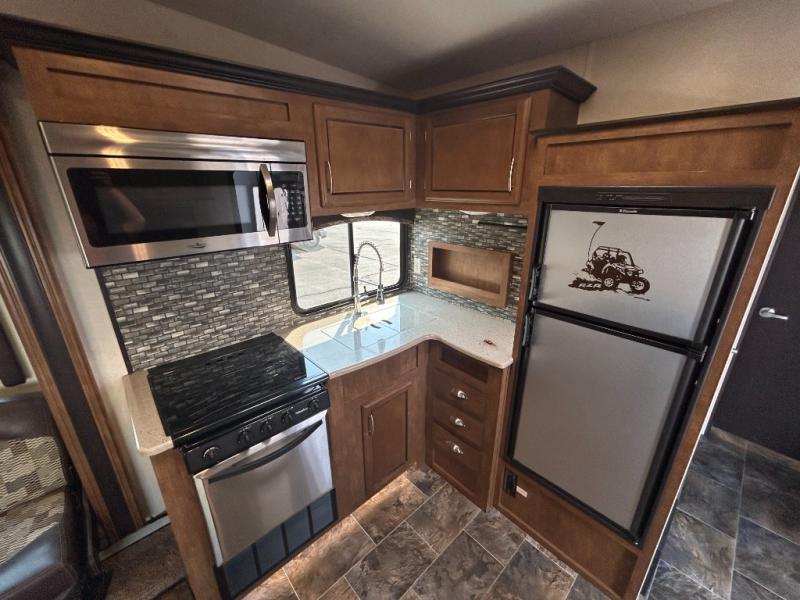 This toy hauler travel trailer includes rear entry for your toys via the easy lift sport ramp. Inside, there is an electric bed with a roll over sofa. Moving forward the road side includes a fold down sofa, a pedestal table, and overhead cabinets. You may choose an optional sofa slide out instead of the fold down sofa. The curb side features two swivel chairs with a table between them as well as more overhead cabinets. You may choose an optional flip up dinette.