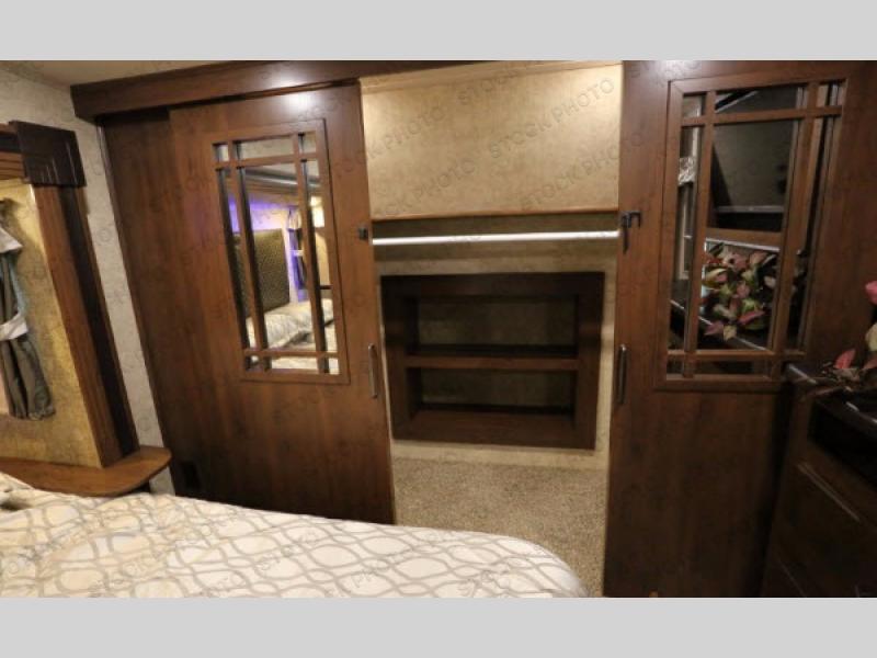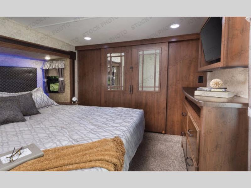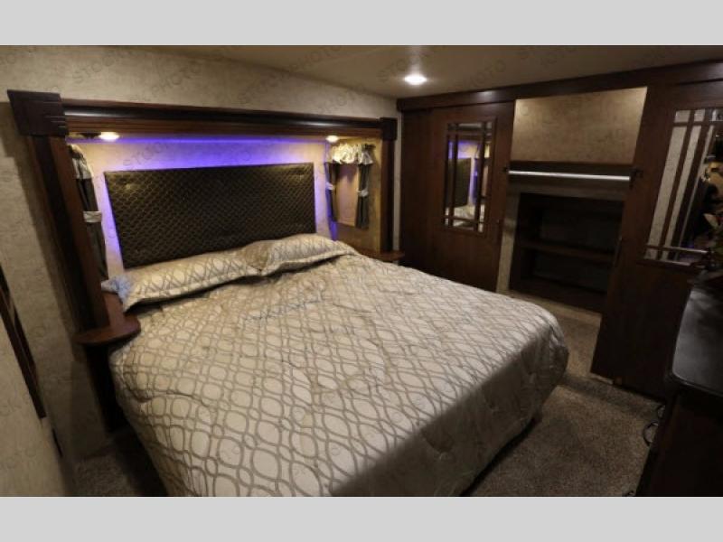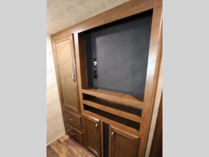 • Private Front Bedroom Suite – Queen bed slide (king optional), front wall wardrobe with washer/dryer prep, and dresser with TV hookup