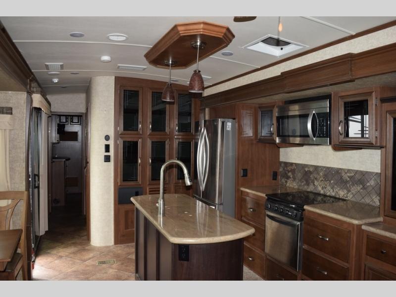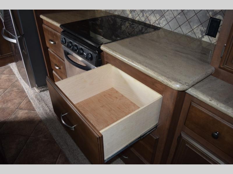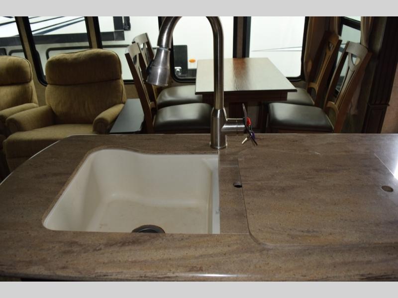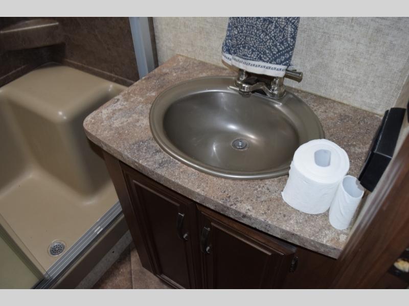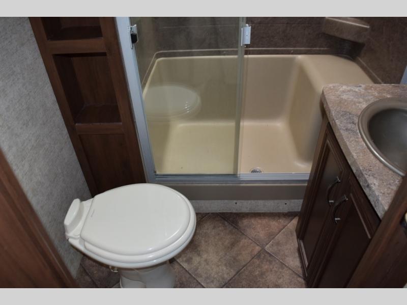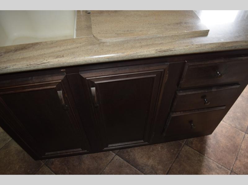 Enter through the front most door and find yourself in the kitchen and living area. There are dual opposing slide outs which help to open up the living space. The first slide out has a free-standing dinette with chairs and two recliners. On the opposite side there is a slide with a 20 cu. ft. house refrigerator, three burner range, microwave, overhead cabinet, two cabinets, an entertainment center and a fireplace. Along the front of the trailer relax on the tri-fold hide-a-bed sofa. There is also an island in the kitchen area with a double kitchen sink. Food storage can be found in the large pantry which is adjacent to the refrigerator.