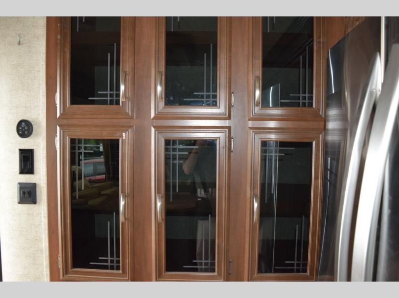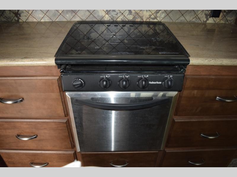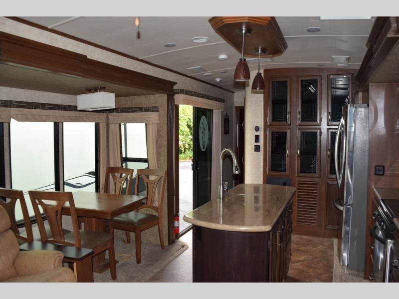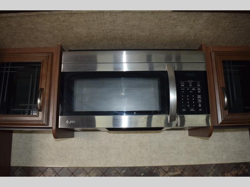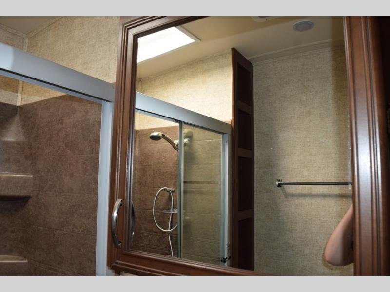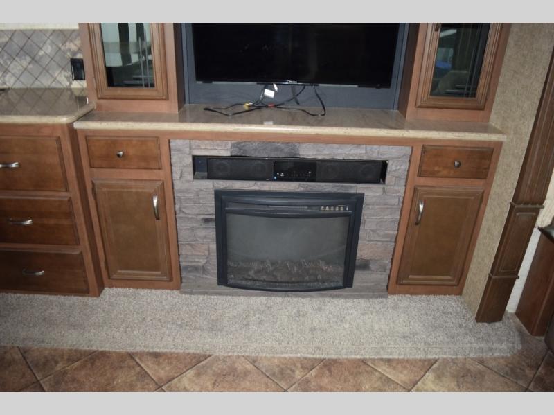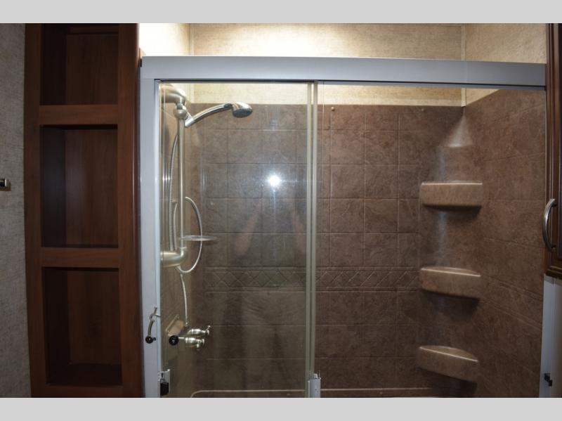 Enter through the front most door and find yourself in the kitchen and living area. There are dual opposing slide outs which help to open up the living space. The first slide out has a free-standing dinette with chairs and two recliners. On the opposite side there is a slide with a 20 cu. ft. house refrigerator, three burner range, microwave, overhead cabinet, two cabinets, an entertainment center and a fireplace. Along the front of the trailer relax on the tri-fold hide-a-bed sofa. There is also an island in the kitchen area with a double kitchen sink. Food storage can be found in the large pantry which is adjacent to the refrigerator.