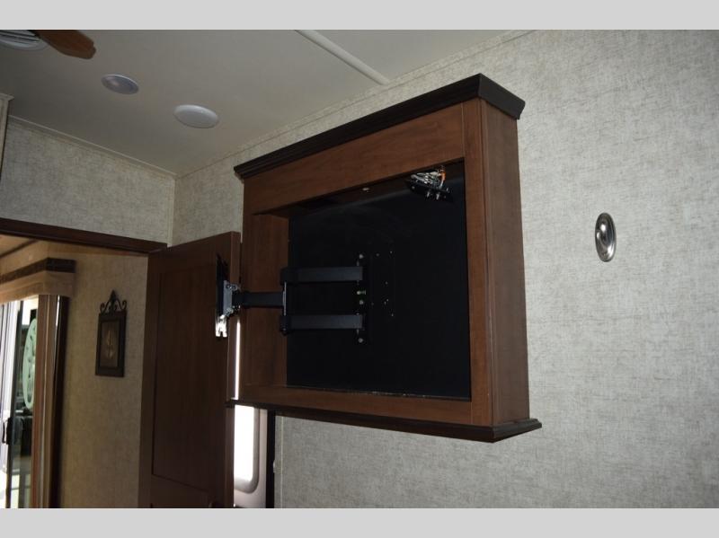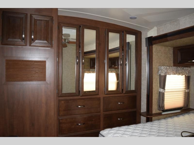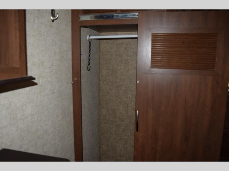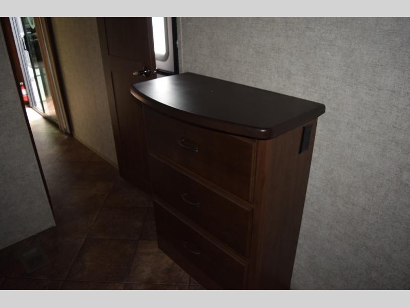 The rear bedroom has a slide out with a king bed. Across from the bed there is a dresser with a TV box. Along the rear wall of the room find a wardrobe and a washer and dryer. There is also an entry door which leads into the bedroom, and more!