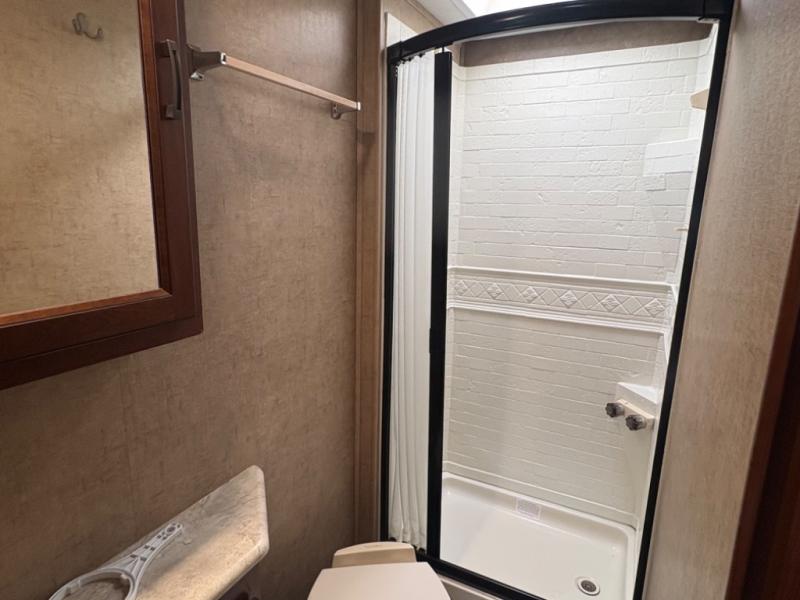 The rear of this unit features a complete bath along the curb side corner. Here you can find a convenient shower, toilet, and vanity with sink, plus overhead medicine cabinet. A curtain can be drawn just outside the bathroom door to the opposite side and section off the bedroom and bathroom space for more privacy at night.