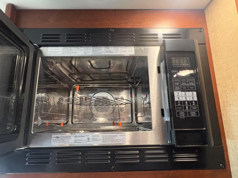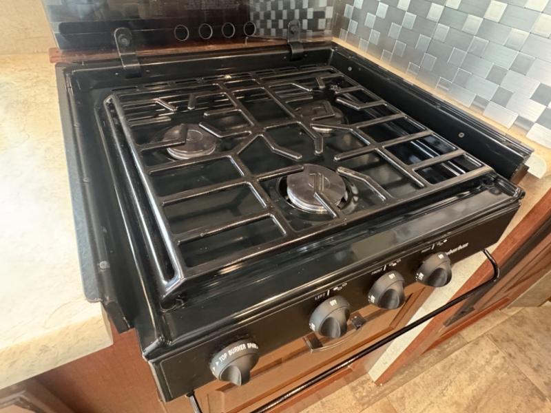 Opposite the dinette you will find the kitchen area which includes a refrigerator, a range top with microwave oven, and round single sink. There is also a flip-up counter for added prep space, or place to set dishes to be washed. There are also overhead cabinets for dishes and things, and a pantry for dry goods next to the dinette in the large slide across the coach.