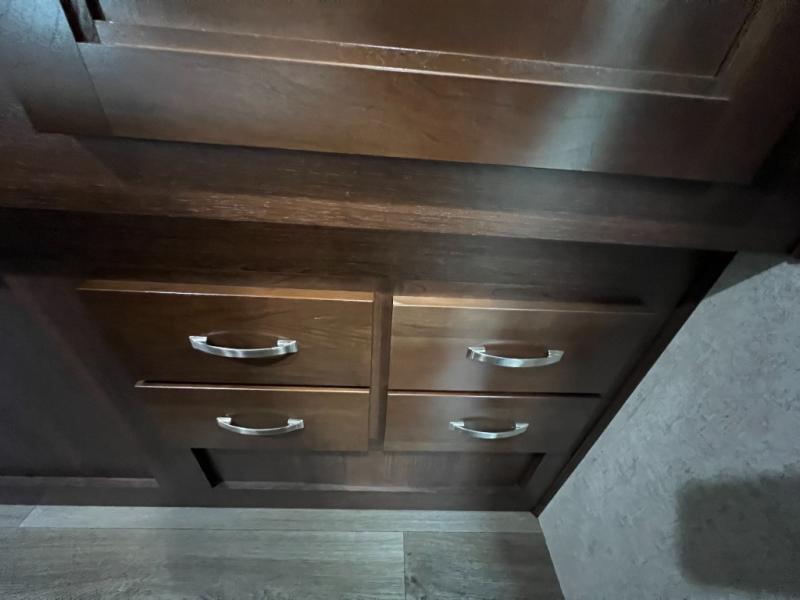 Opposite the kitchen, a slide out has a spacious u-shaped dinette, or you can choose an optional dream dinette, sofa with overhead cabinet storage running the width of the slide, or in place of the sofa you can choose optional recliners.