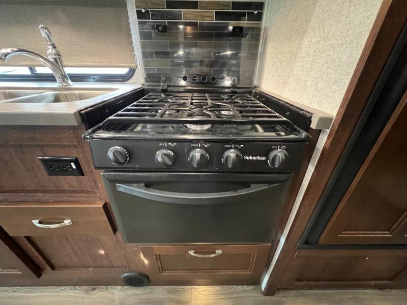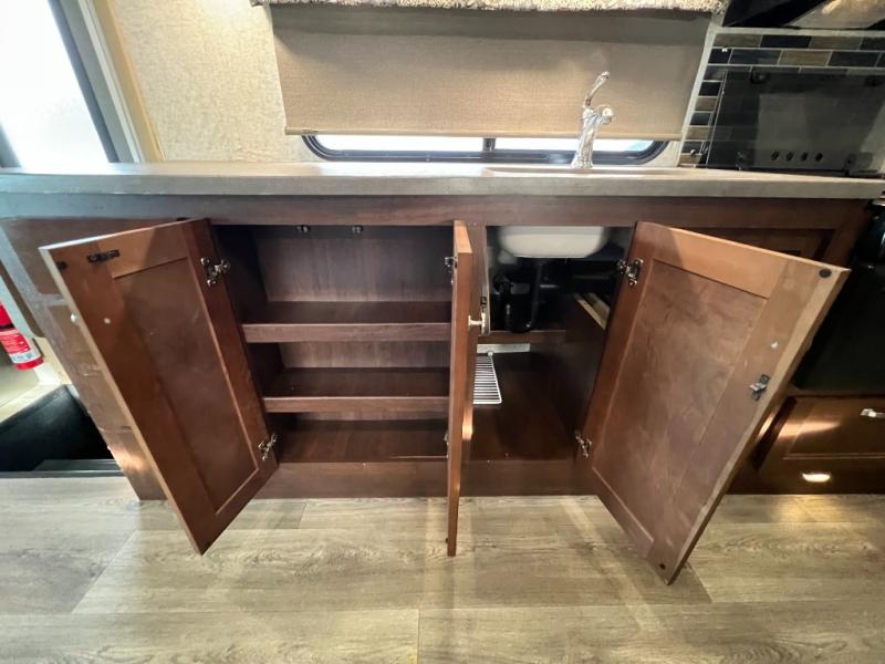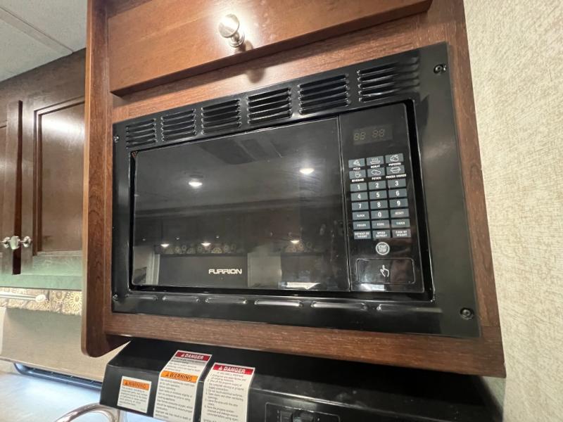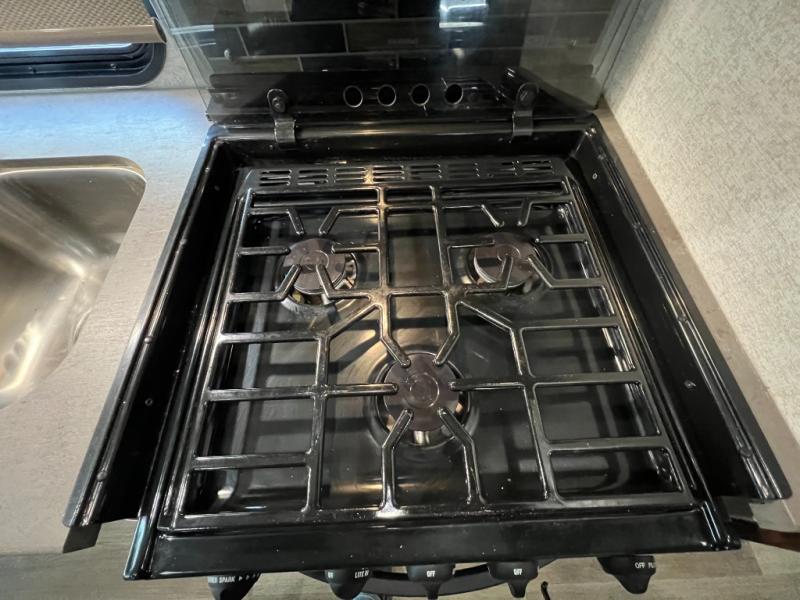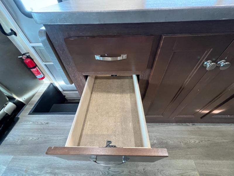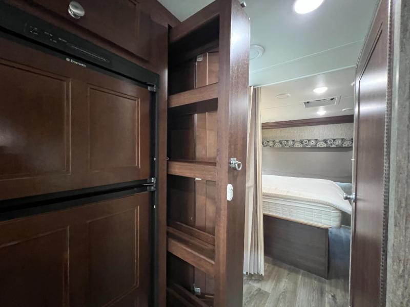 As you enter this class C motorhome, to your left is the kitchen. It features a counter space with a flip down counter extension, overhead cabinets, double kitchen sink, three burner stove with overhead microwave, refrigerator, or you can choose an optional four-door refrigerator, and pantry.