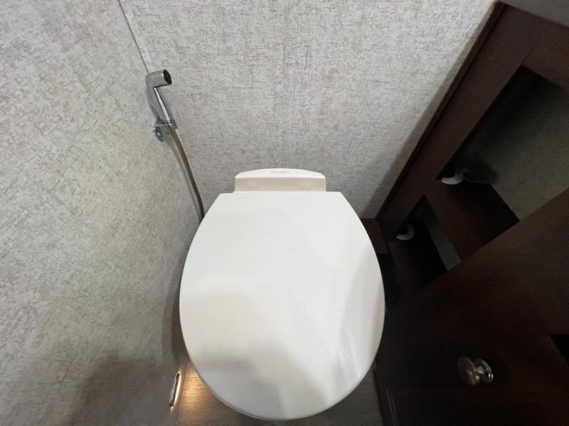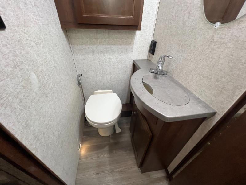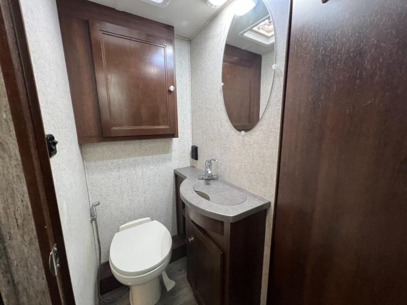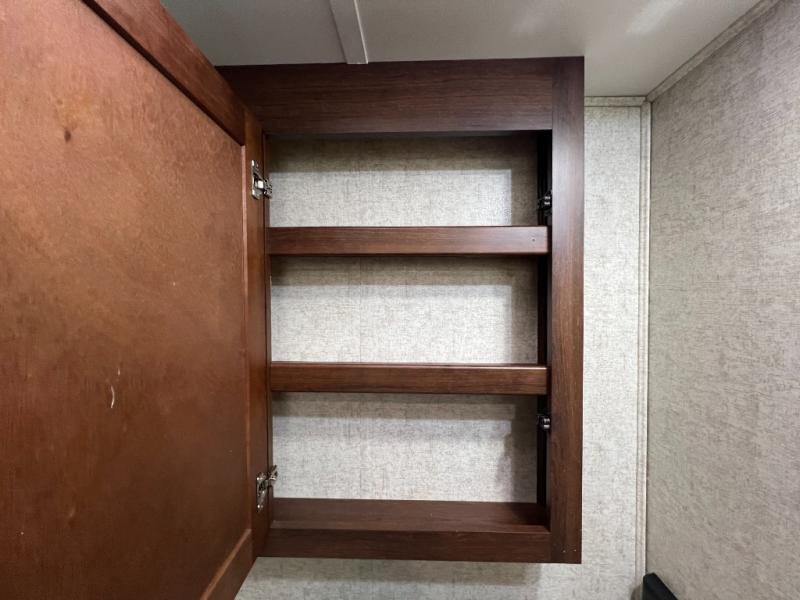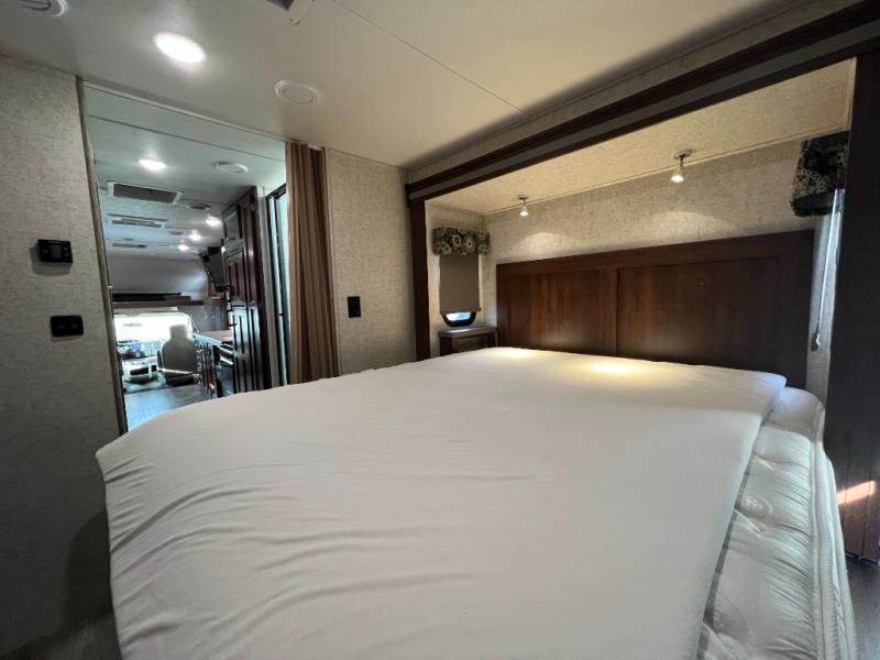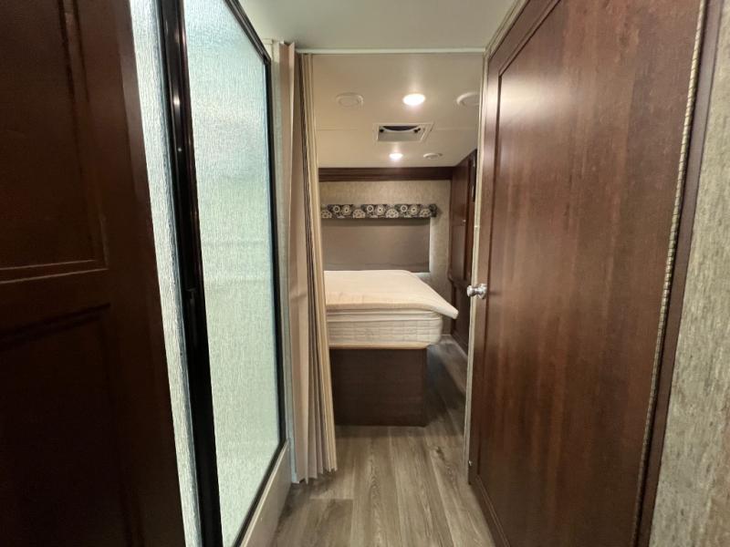 As you continue toward the back of the motor home, there is a split bathroom with a shower on one side and a private toilet area with overhead cabinets, a sink with extended vanity and medicine cabinet. The rear of the Sunseeker 3010DS offer a private bedroom. The queen size bed is within a slide and includes one nightstand. Across from the bed, the wall contains double wardrobes with linen storage and space for an optional TV between them.