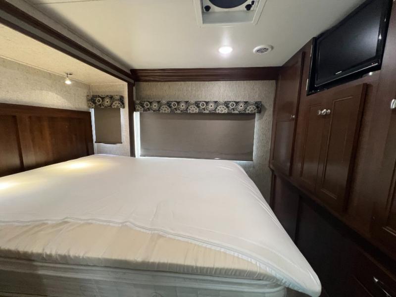 Back at the front, the area over the cab comes standard with storage and a 60" x 80" bunk, or you may choose optional cabinets with a 42" TV or optional 32" TV with twin beds.