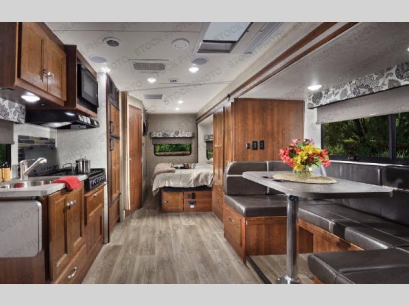 Step inside model 2400W and notice how open it feels with the entire road side extended out. Starting with a u-shaped dinette and two sets of seat belts to keep everyone safe while traveling. There are even cup holders in the table which is great for keeping your drinks safe while moving.