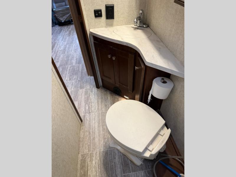 The rear of this unit features a complete bath along the curb side corner. Here you can find a convenient shower, toilet, and vanity with sink, plus overhead medicine cabinet. A curtain can be drawn just outside the bathroom door to the opposite side and section off the bedroom and bathroom space for more privacy at night.