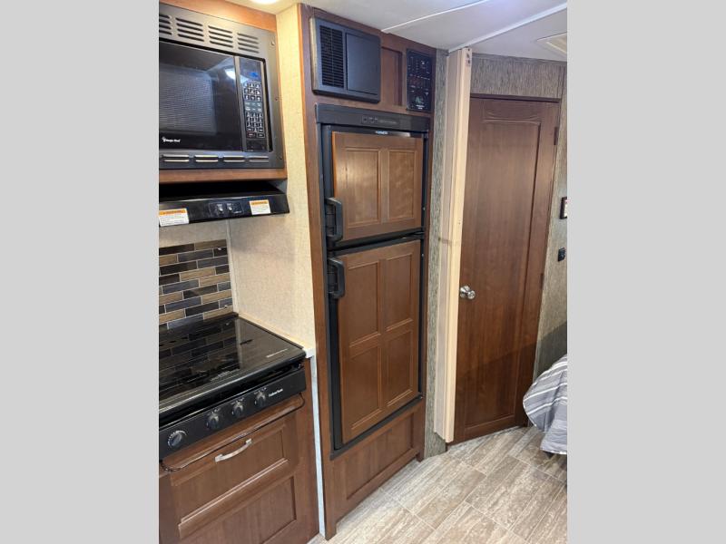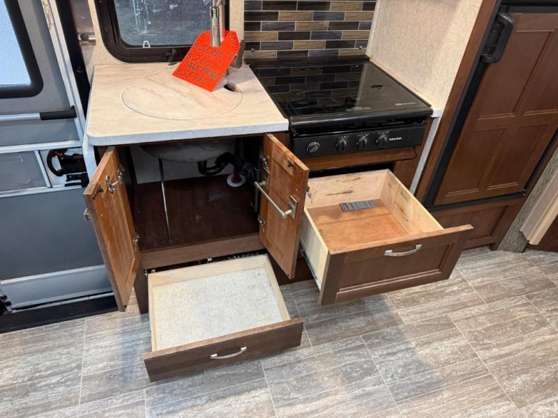 Opposite the dinette you will find the kitchen area which includes a refrigerator, a range top with microwave oven, and round single sink. There is also a flip-up counter for added prep space, or place to set dishes to be washed. There are also overhead cabinets for dishes and things, and a pantry for dry goods next to the dinette in the large slide across the coach.