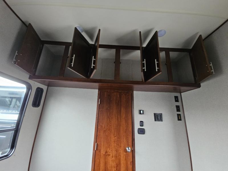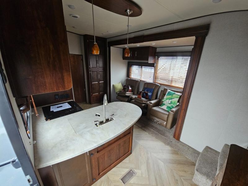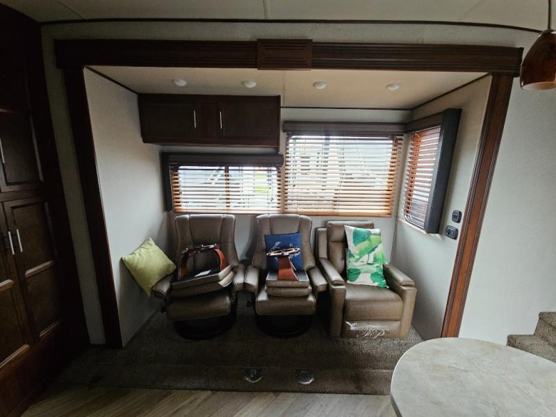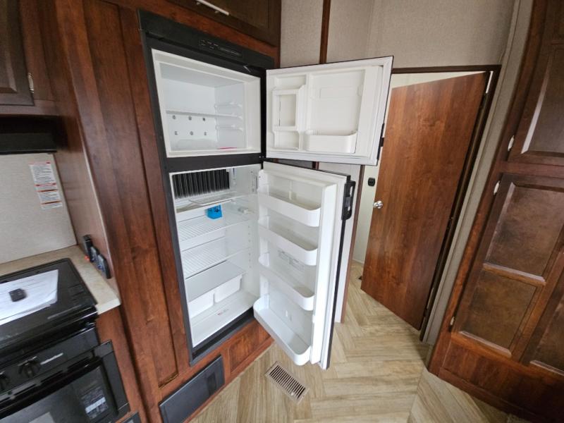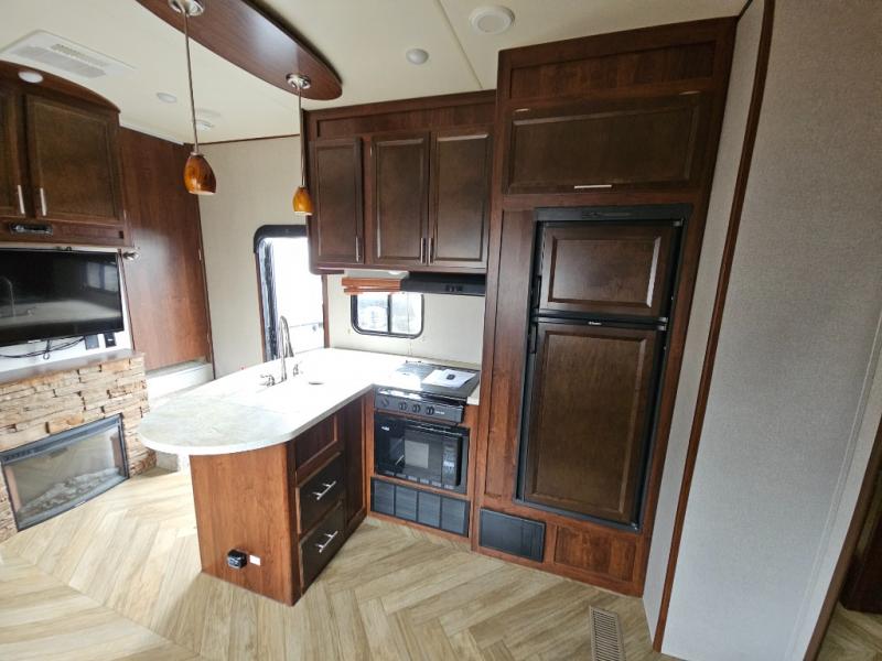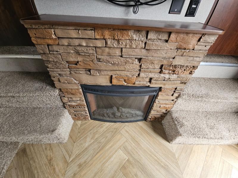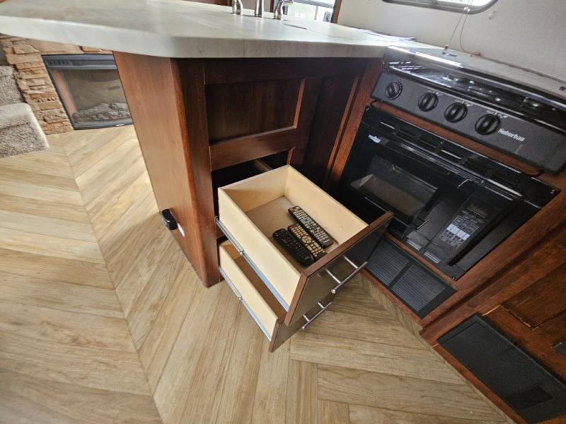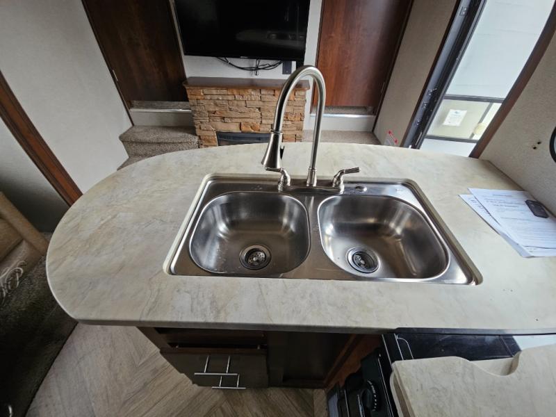 In the kitchen you will find a refrigerator, three burner range, and double kitchen sink as well as a bit more prep space on the L-shaped counter. The opposite side has a slide out sofa with recliners and overhead storage. You can relax on the sofa and enjoy the entertainment center with fireplace on the interior wall.