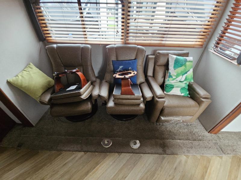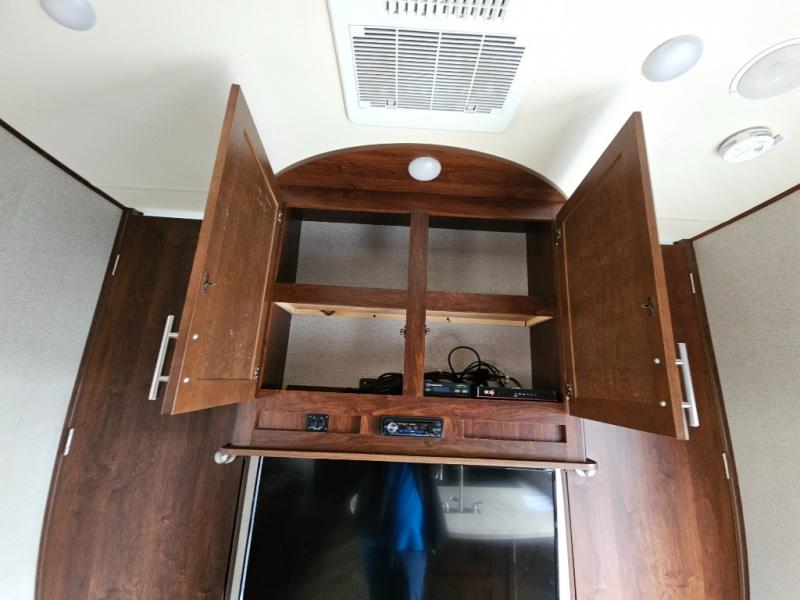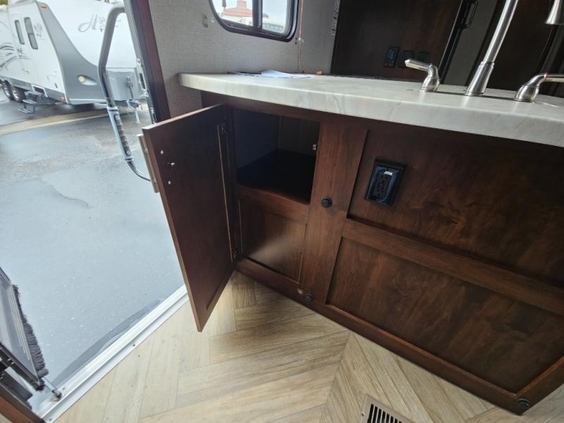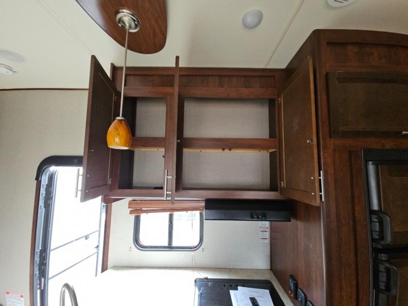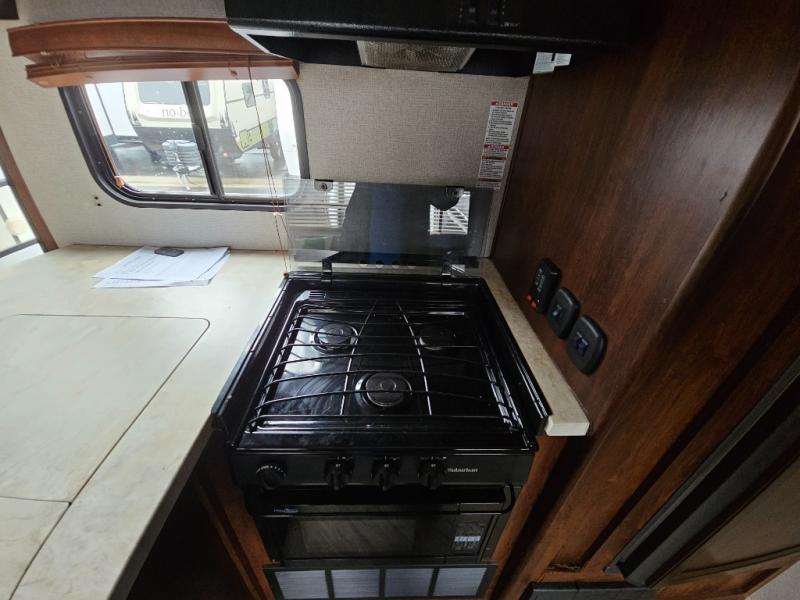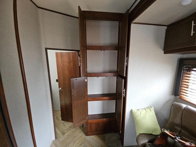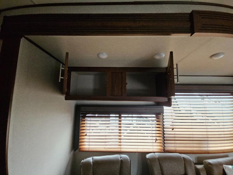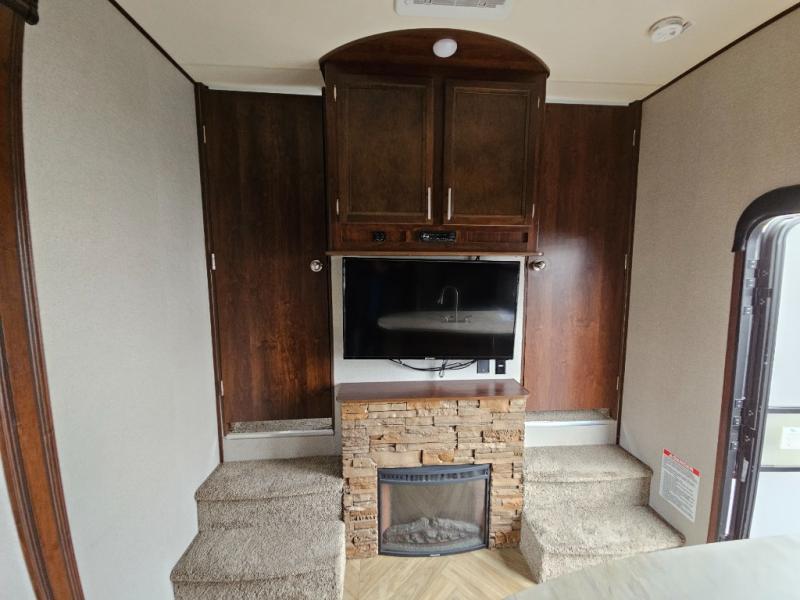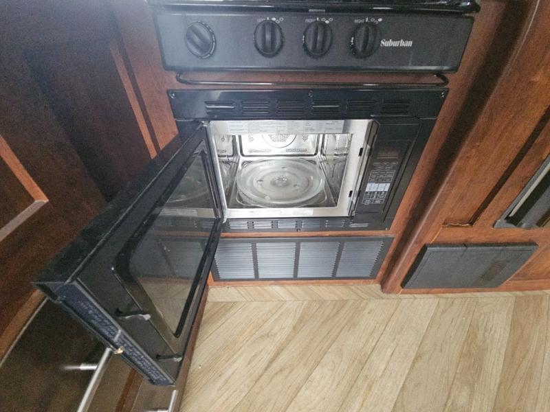 In the kitchen you will find a refrigerator, three burner range, and double kitchen sink as well as a bit more prep space on the L-shaped counter. The opposite side has a slide out sofa with recliners and overhead storage. You can relax on the sofa and enjoy the entertainment center with fireplace on the interior wall.