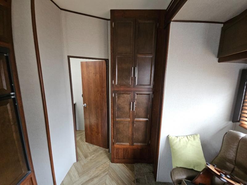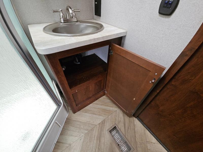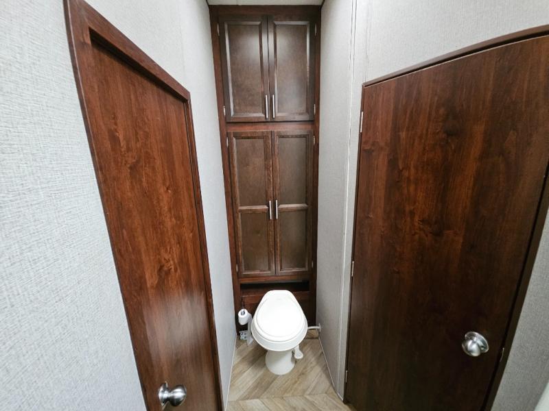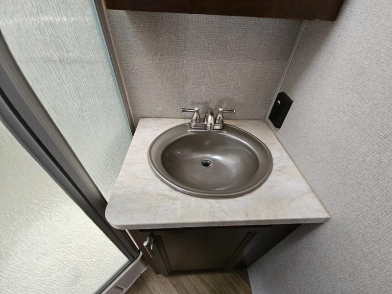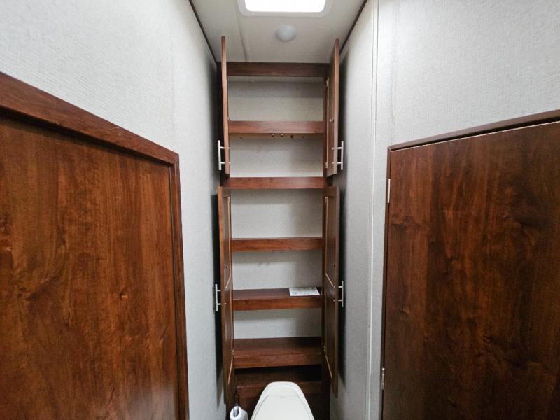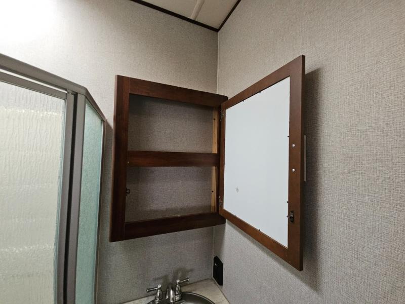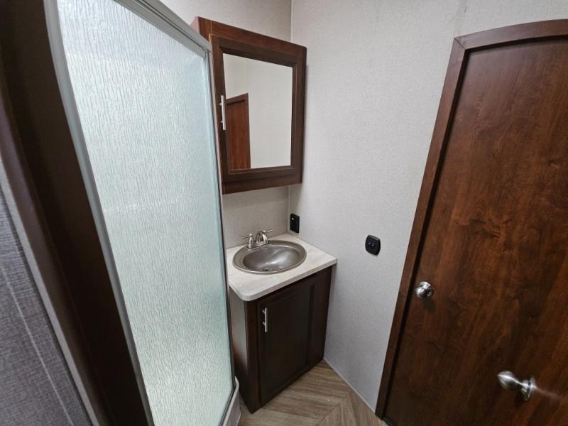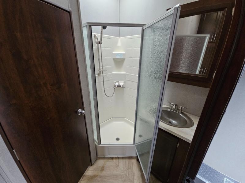 Continuing through the fifth wheel from the cargo area, you will come to the bathroom. Here you will find a sink, medicine cabinet, and a neo-angle shower along one side of the fifth wheel. Along the opposite side there is a toilet and a linen cabinet.