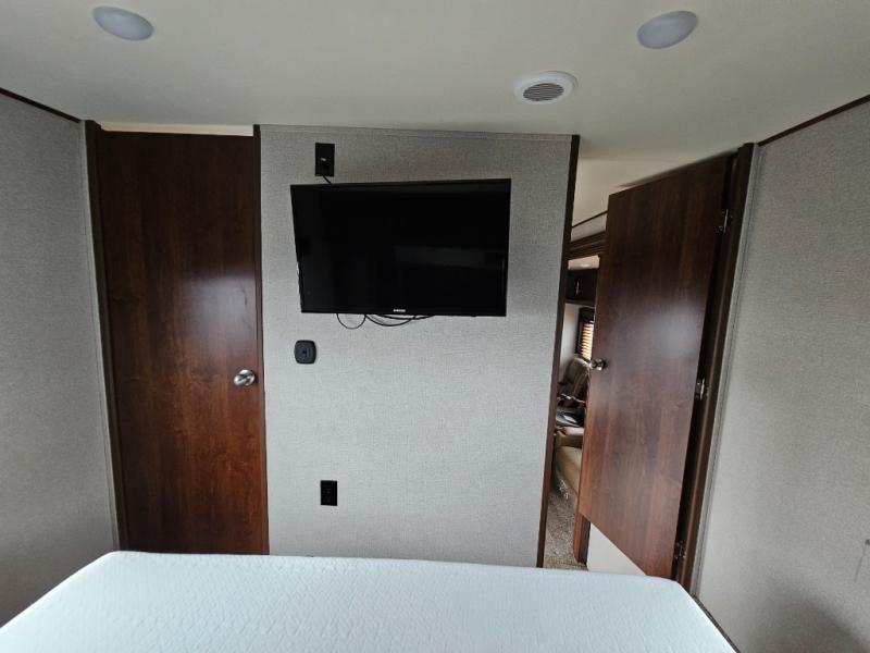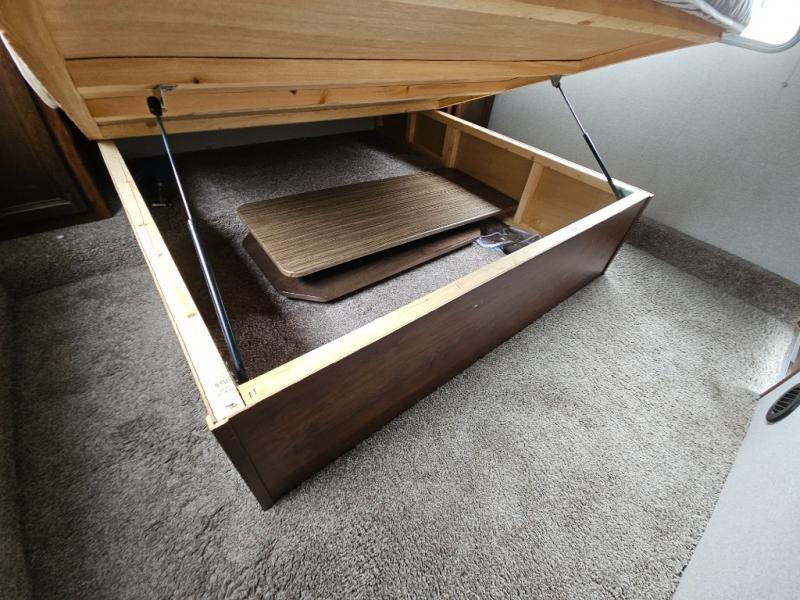 There is a set of steps on either side of the entertainment center which will lead you directly into the front bedroom. You can relax after a hard day of playing outside on the comfortable queen bed. Along either side of the bed there are wardrobes for all of your hang up clothes, and much more!