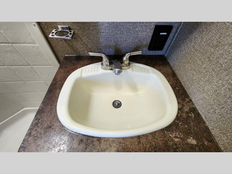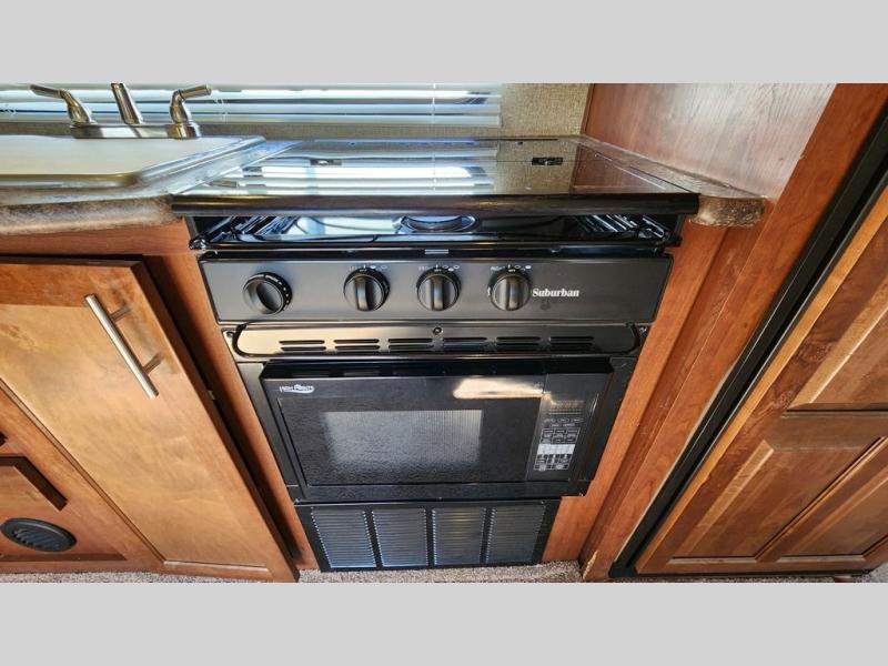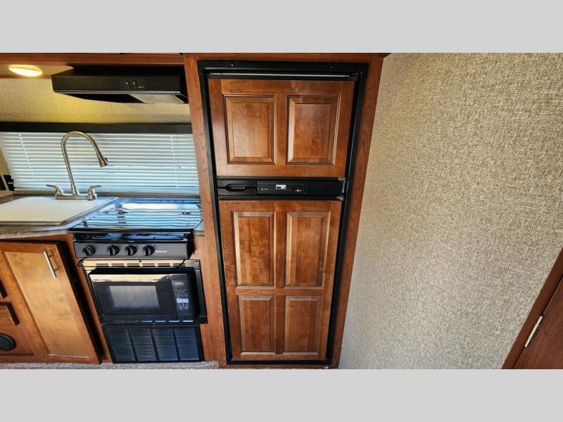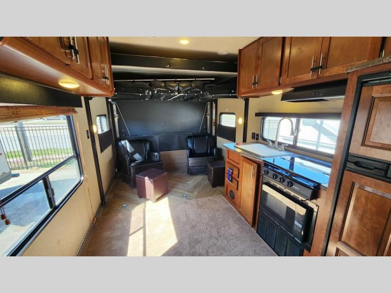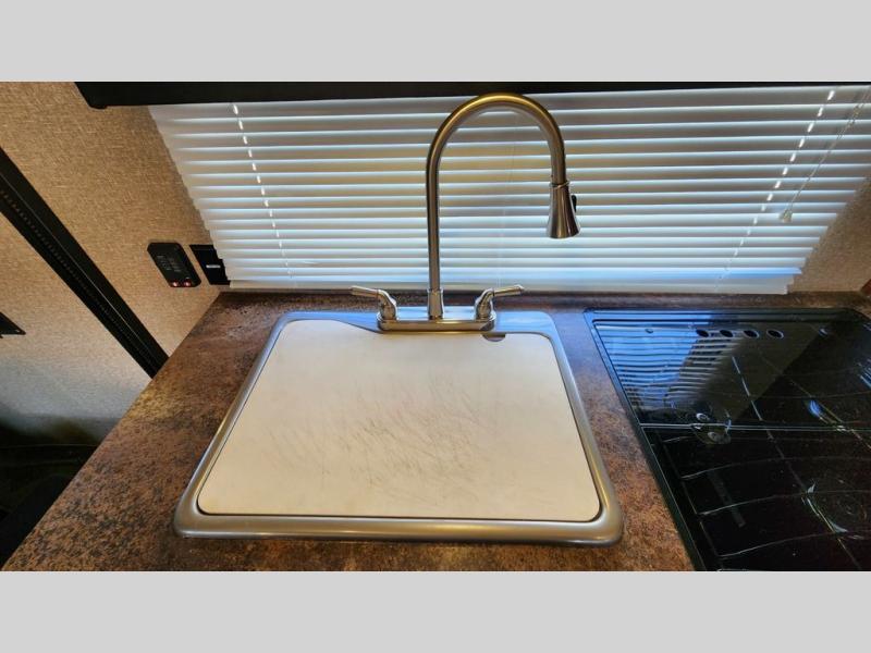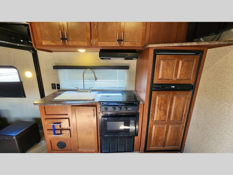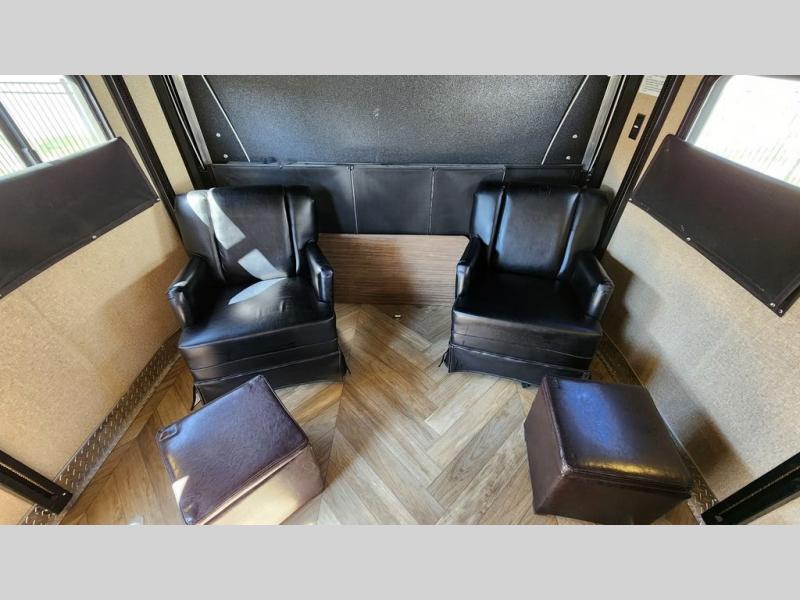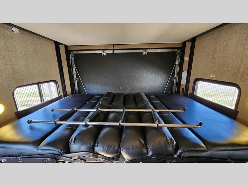 In the rear of the toy hauler, you will find two flip-up sofas with a free standing table. After your gear is unloaded this area makes for a nice area to enjoy your meals during the day, and at night you can easily convert the sofas into additional sleeping space.