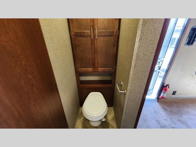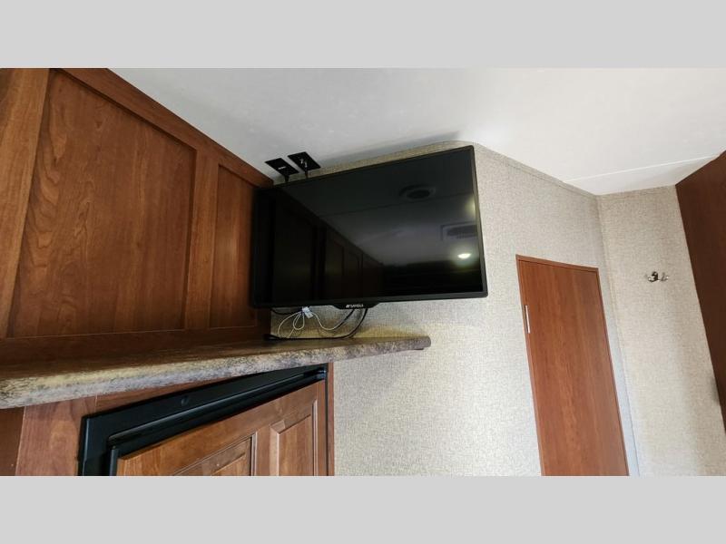 There are plenty of overhead cabinets throughout this toy hauler as well as outside storage and a mount for an outside TV, and more!