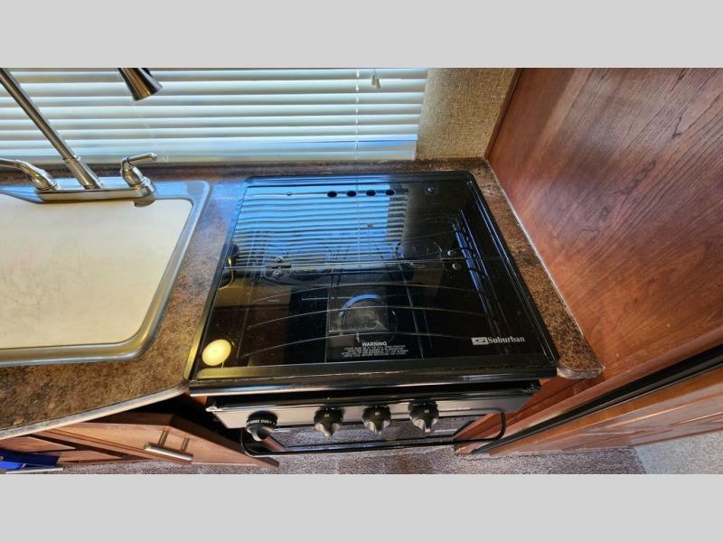 The kitchen area offers a double kitchen sink, three burner range, microwave, and a refrigerator. Above the refrigerator you will find a TV. There is a closet next to the entrance door. To the left of the entry door you will find two optional chairs, an overhead cabinet.