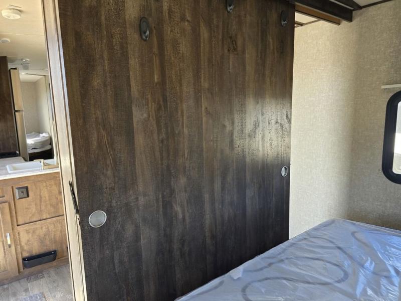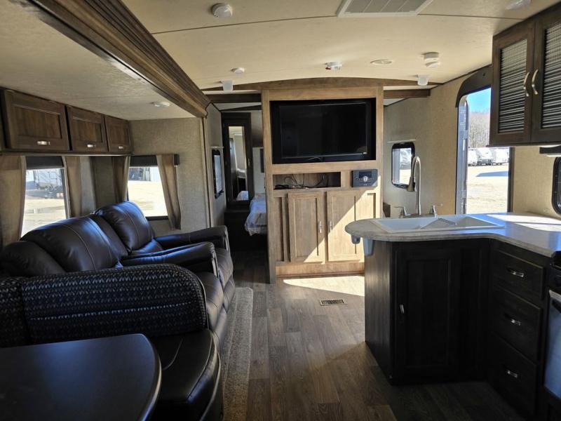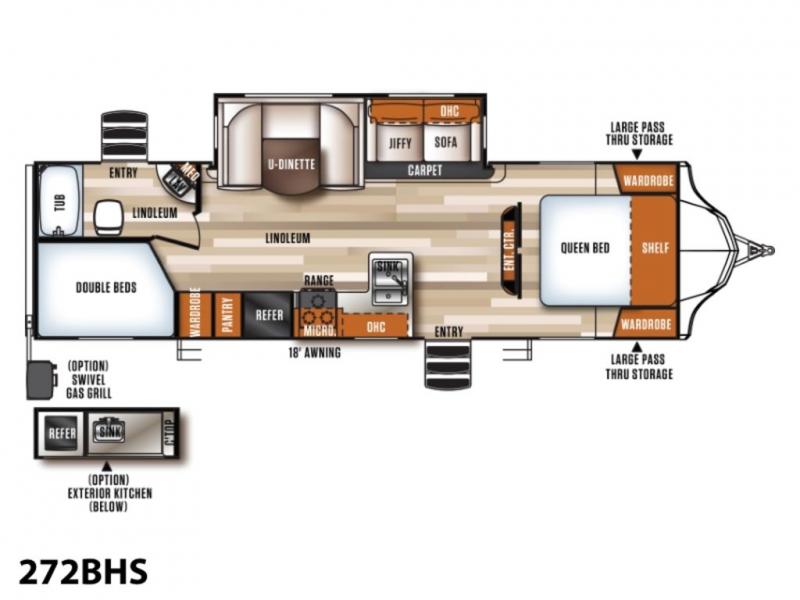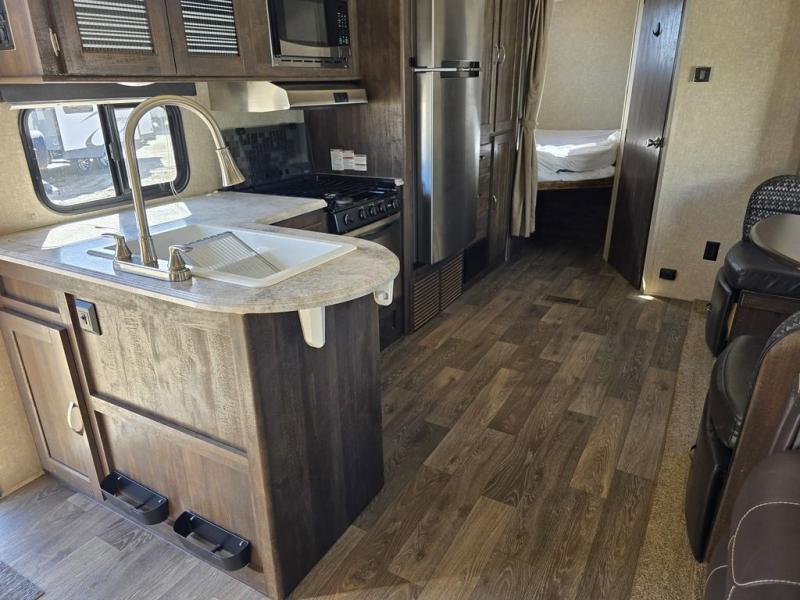 As you enter the travel trailer, to the left there is a double kitchen sink, three burner range, microwave, refrigerator, pantry, and wardrobe. Along the opposite side of the trailer you will find a slide out with a u-dinette and a jiffy sofa. Along the front of the living area you will enjoy the entertainment center.