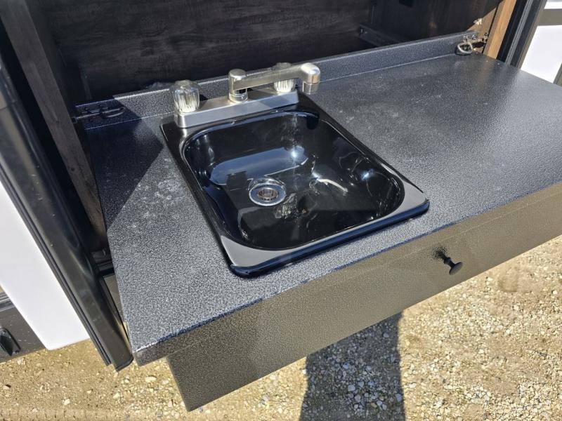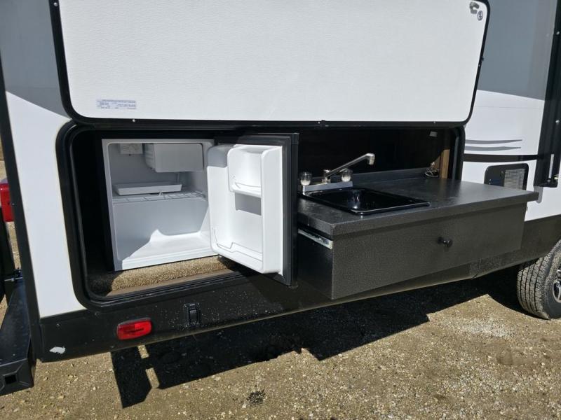 Outside you can enjoy the optional exterior kitchen which includes a sink, refrigerator, and counter space. There is also an optional swivel gas grill that you can choose for your trailer. Find the exterior pass through storage area super handy for all of your extra camping gear, and more!