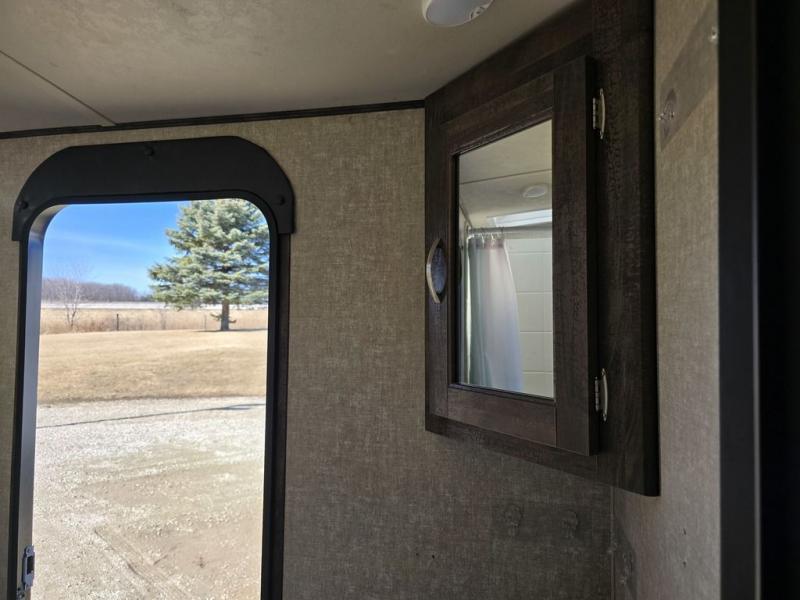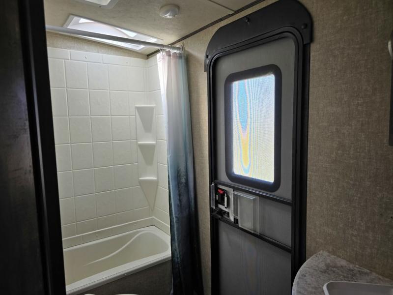 As you proceed toward the rear of the travel trailer, the double bed bunk house is on the left side. On the right side of the trailer is the bathroom. Inside the bathroom you will find a toilet, tub, sink, and medicine cabinet. There is also a private entrance from the bathroom leading outside.