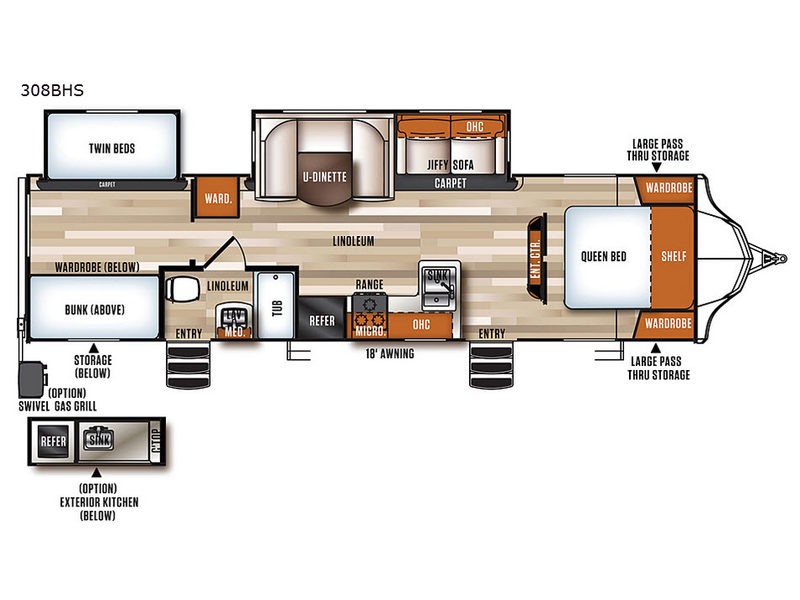 Double slide outs, a rear bunk house, and two entry doors are just a few of the features that you will love on the Vibe 308BHS travel trailer by Forest River.