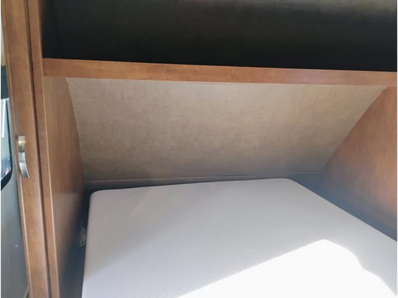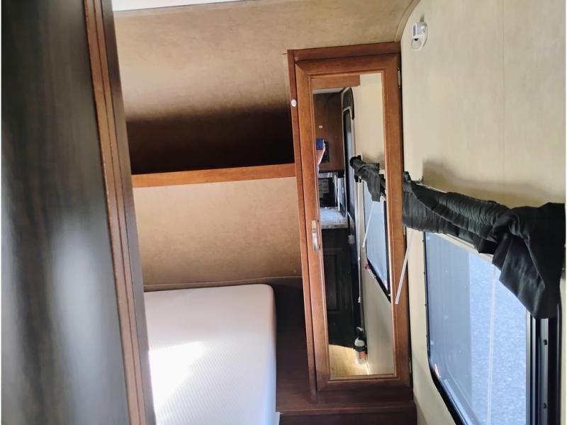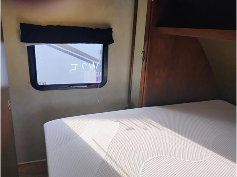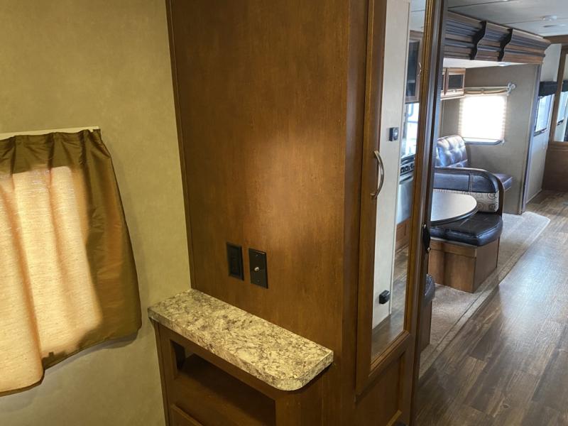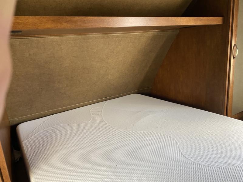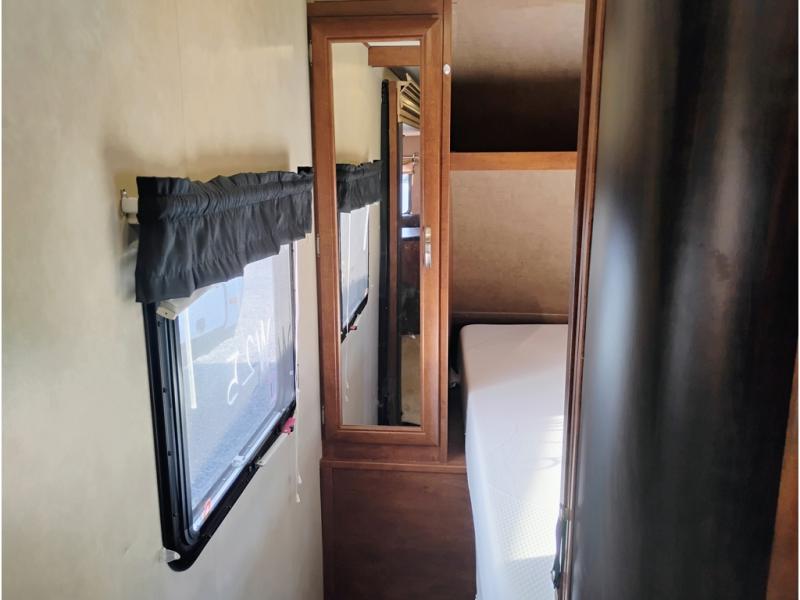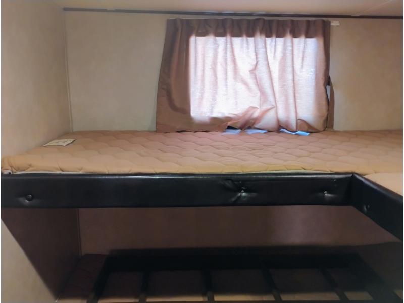 Enter model 287QBS and notice the front bedroom just beyond the entertainment center with a sliding door on either side. Enjoy sleeping on a queen size bed with dual wardrobe, and an overhead shelf above the bed for your things.