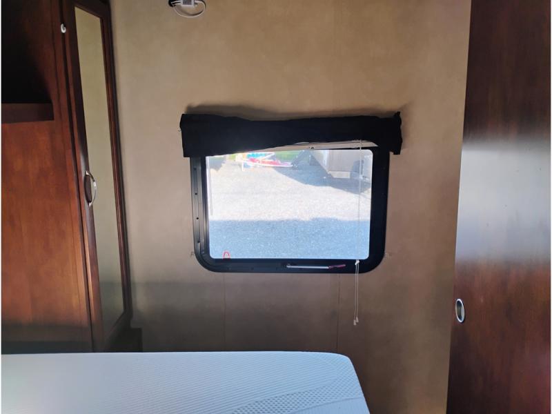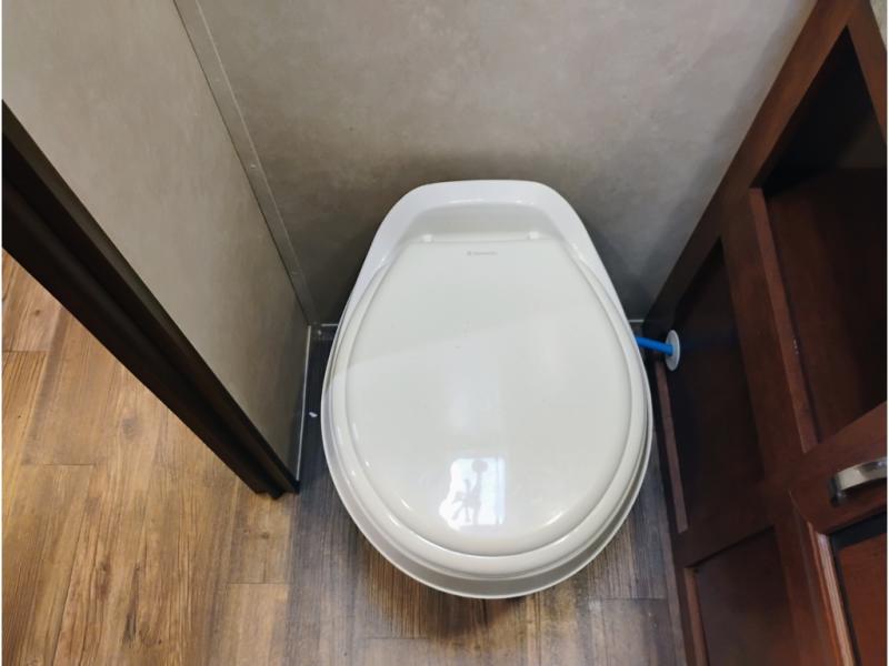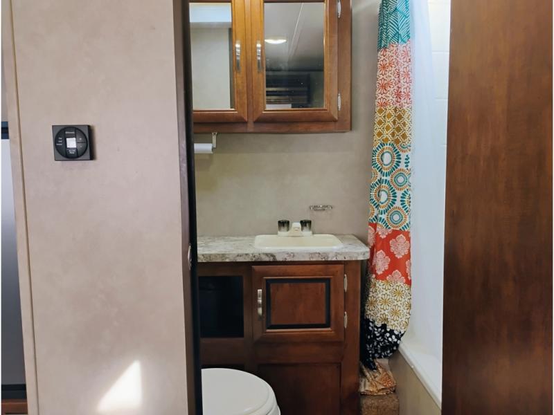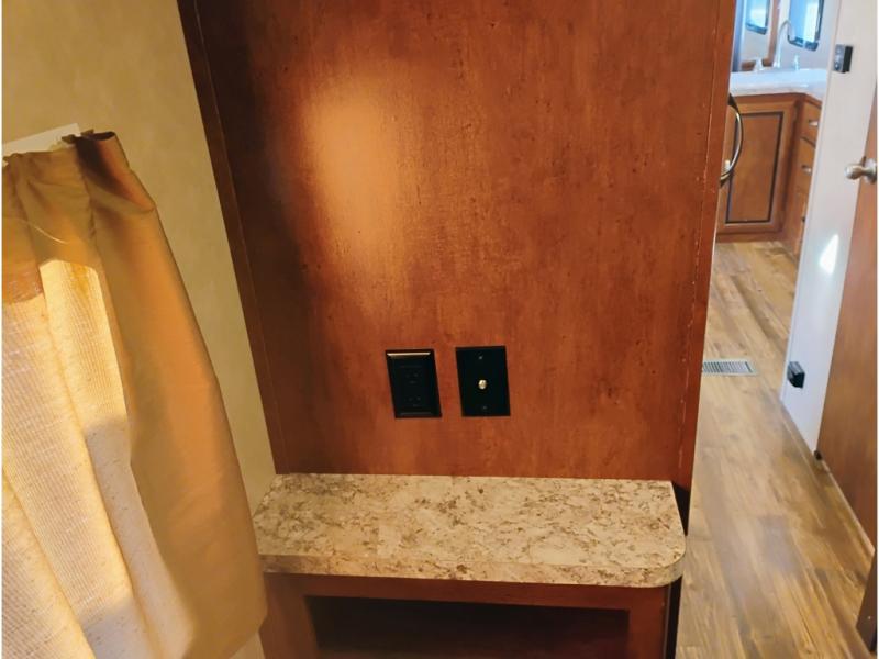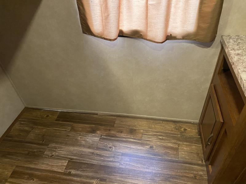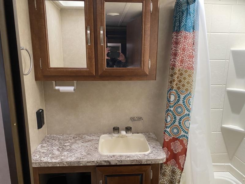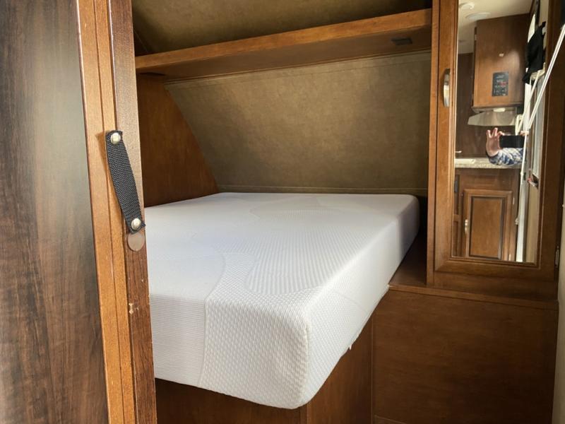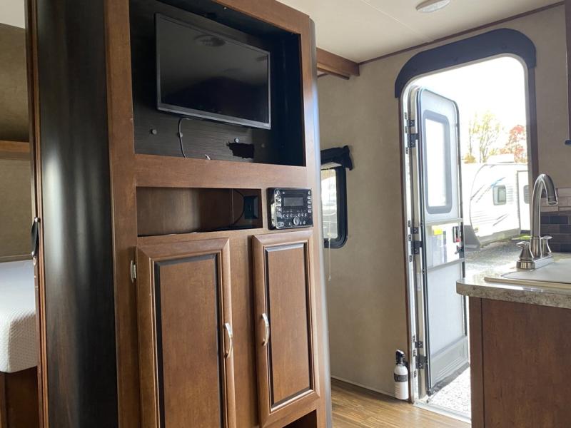 Enter model 287QBS and notice the front bedroom just beyond the entertainment center with a sliding door on either side. Enjoy sleeping on a queen size bed with dual wardrobe, and an overhead shelf above the bed for your things.