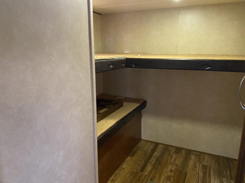 Just outside the bathroom in the rear of this Vibe Extreme Lite travel trailer you will find a sliding door leading into a private bunkhouse. Here you will find a wardrobe just inside the door to your right along with an entertainment center. There is Vibe Cube seating beneath an upper bunk along the rear wall, and a set of bunks along the curb side.