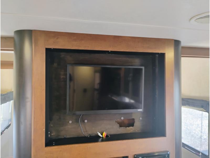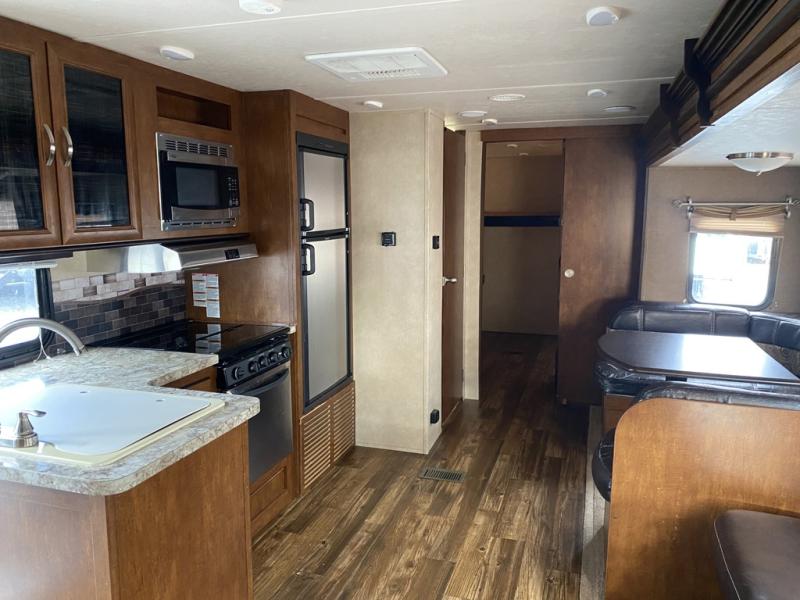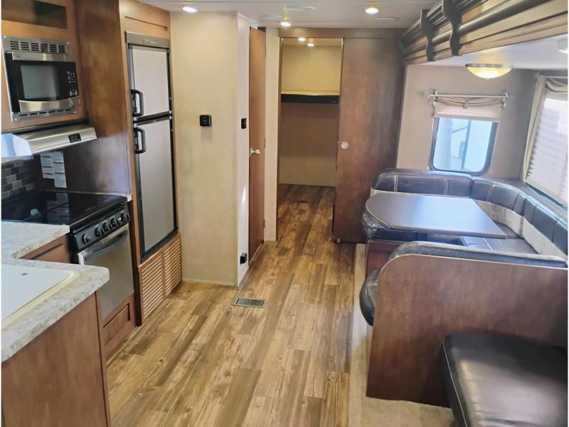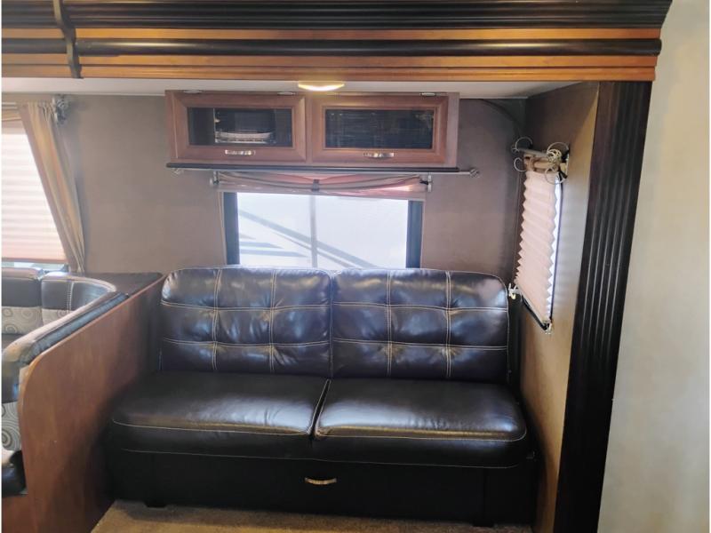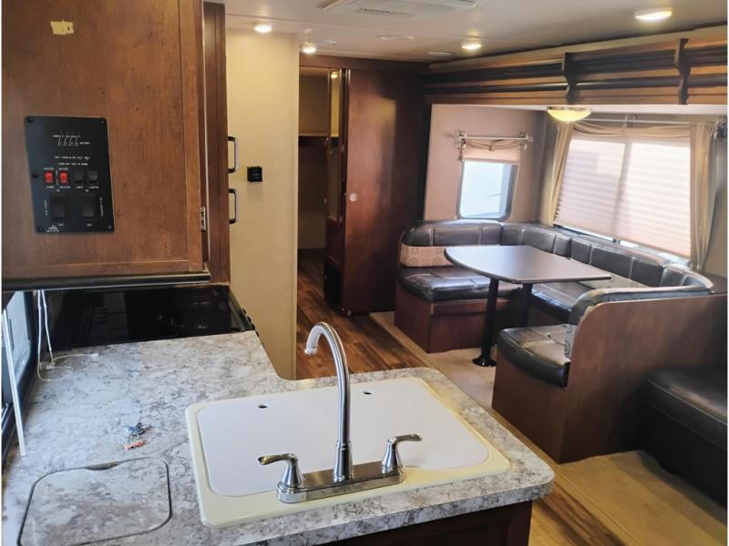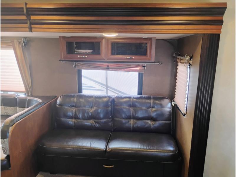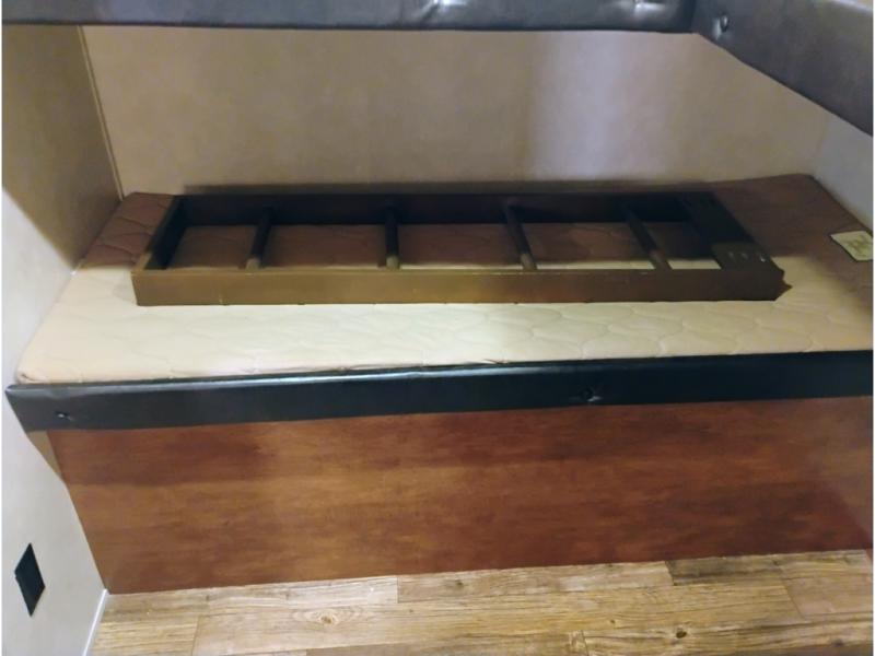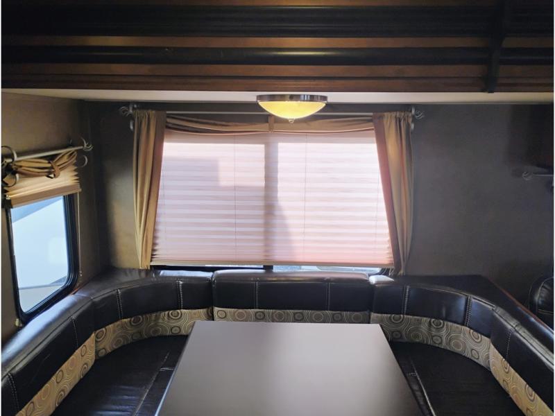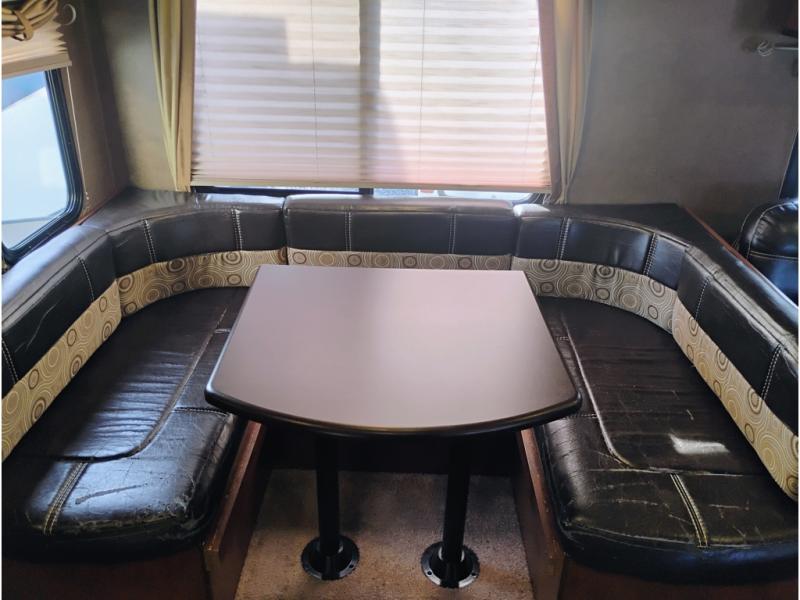 Opposite enjoy plenty of seating in this large single slide out. The u-shaped dinette is great for mealtime, and there is also a jiffy sofa with storage above so you can relax and hang out. Both can easily view the entertainment center, and both can easily be made into added sleeping space at night when needed.