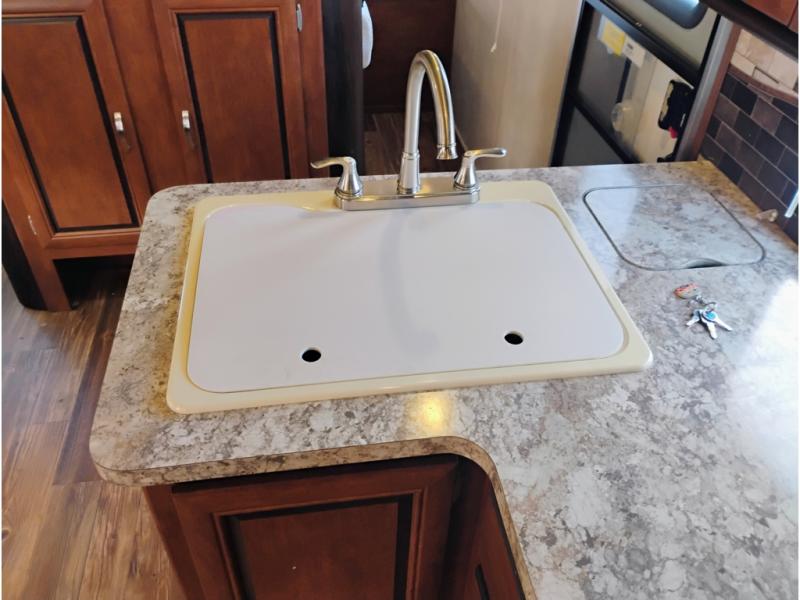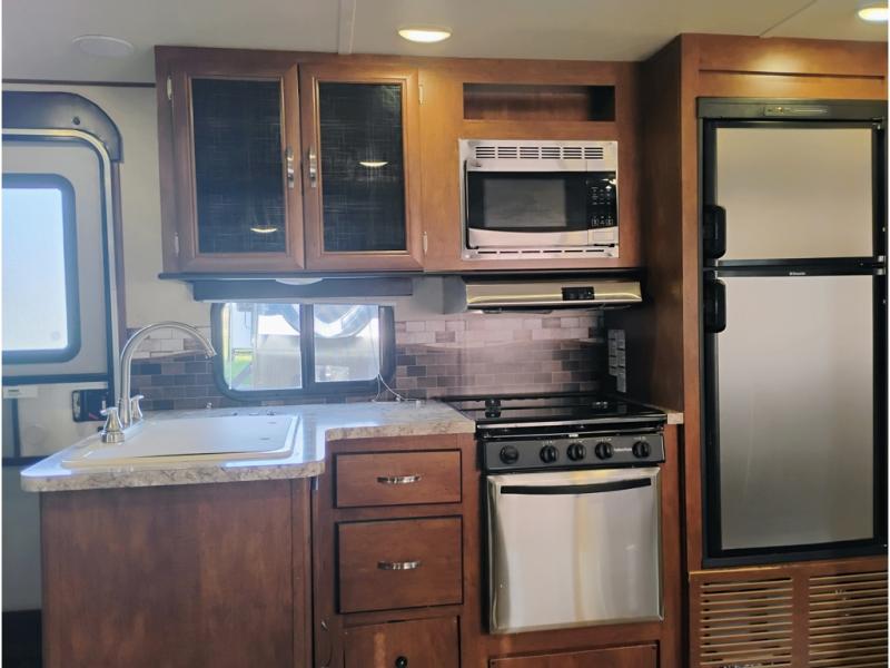 To the left of the entry door you will find an L-shaped counter with double sink, a three burner range with overhead microwave oven, and a 6 cu. ft. refrigerator. You will also find overhead storage to tuck away your dishes and anything you need to whip up light meals and snacks for your family.