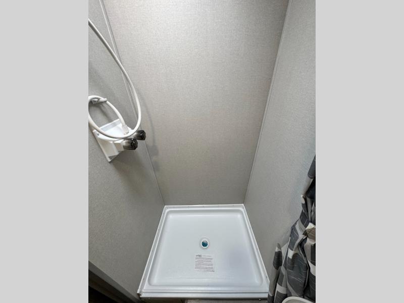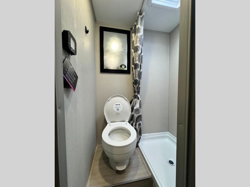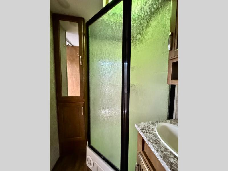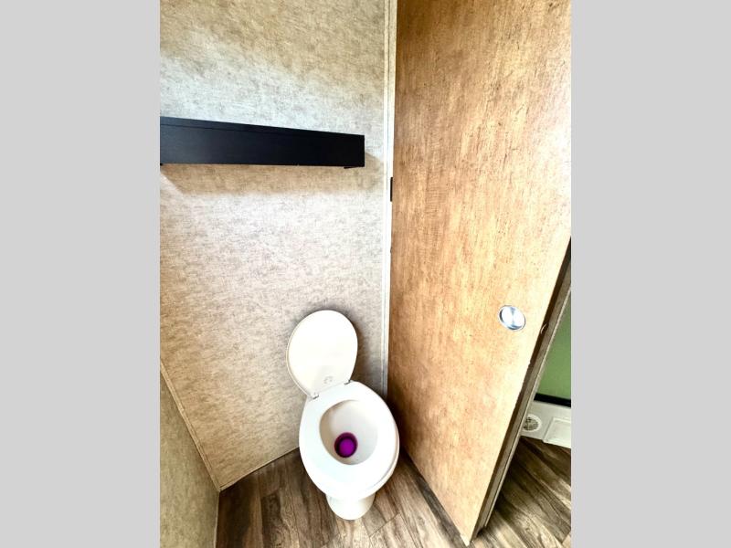 The rear bath features double entry doors so you can access it quickly from either the inside or when enjoying the great outdoors. You will love the convenience of an angled shower, a sink with overhead cabinet, plus linen storage as well. There is also a sliding door to separate the private toilet area from the rest of the bath where you will also find a closet for linens or clothing storage.