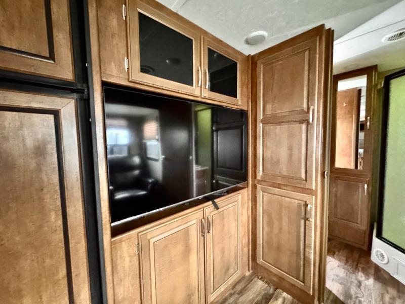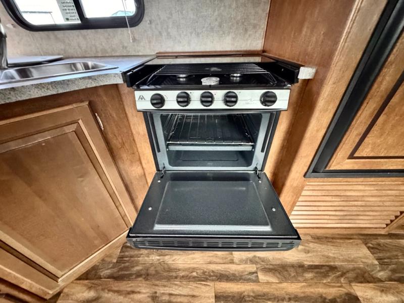 Enter the door furthest to the front and find an open combined kitchen and living space featuring a large slide out hide-a-bed sofa and booth dinette. Both provide ample seating for meals, or when you need some down time from your outdoor fun. At night you can easily make either into added sleeping space for family or overnight guests. The nearby entertainment center can be viewed by any seating in the room, plus from inside the kitchen area as well.