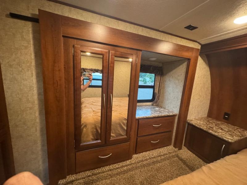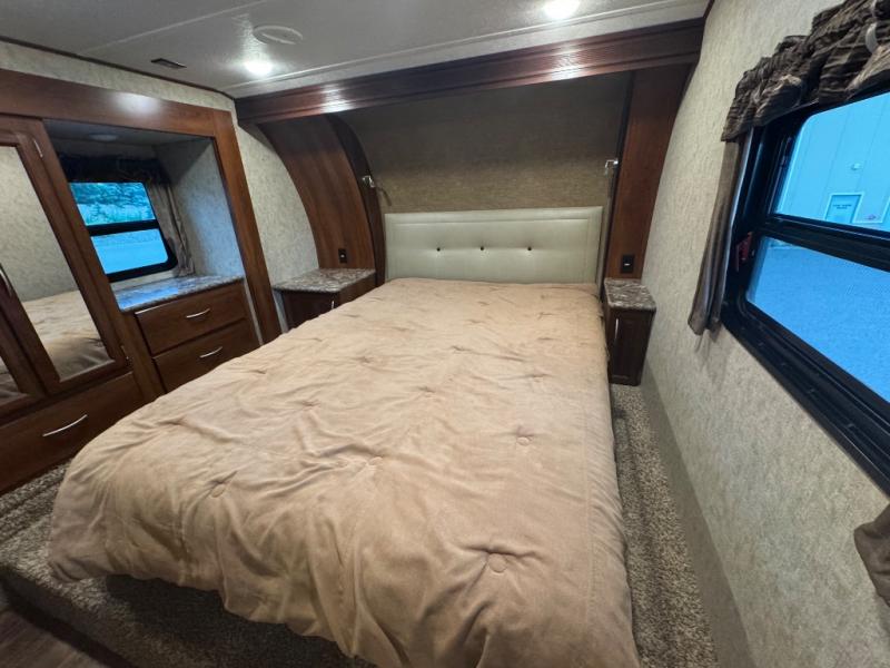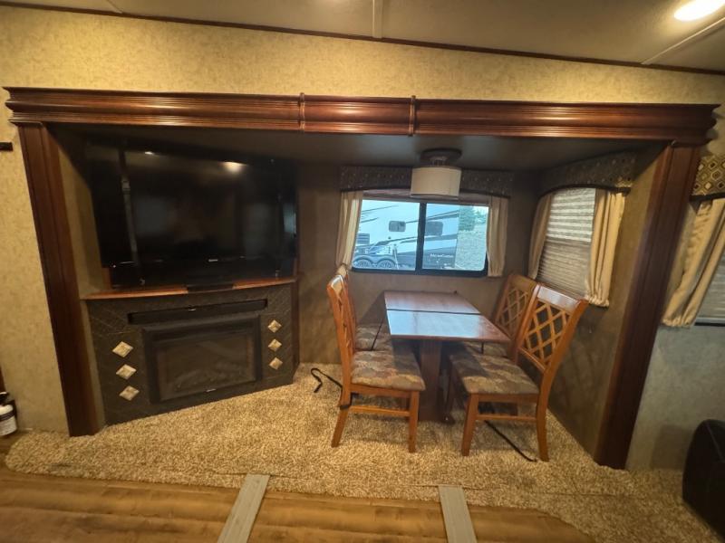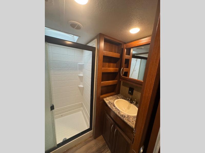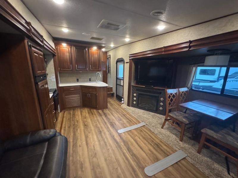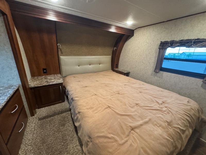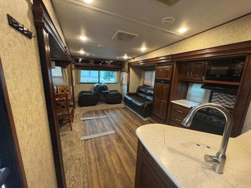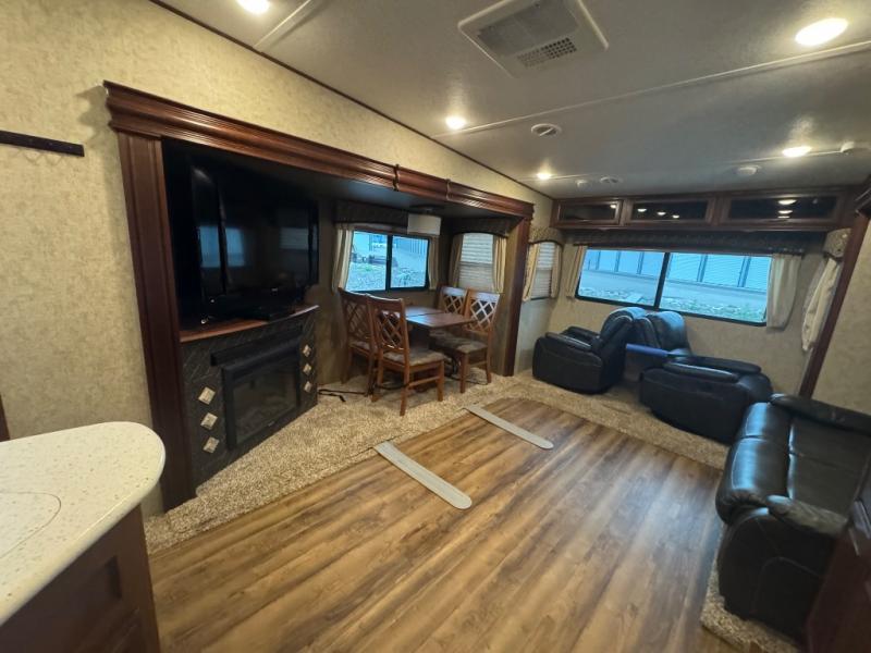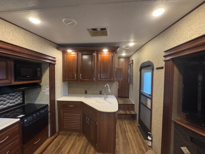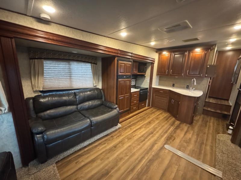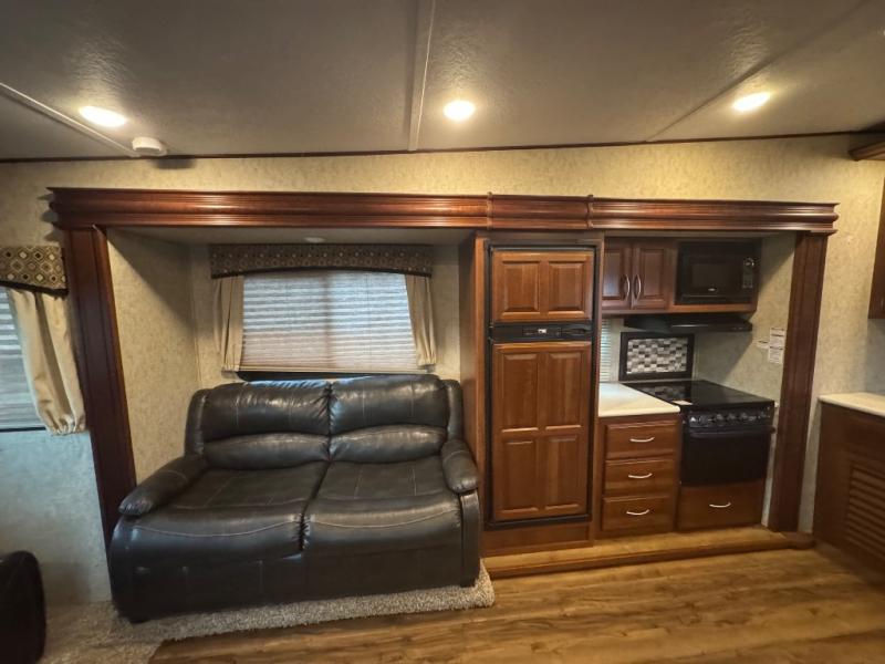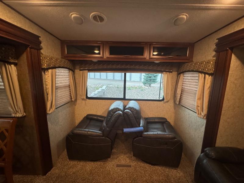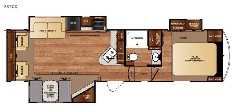 Straight in front of you as you enter is an angled double kitchen sink, extra counter space for meal prep, and an overhead cabinet for dishes. The kitchen/living area have dual opposing slides which help to open up the floor space. The first slide out has an 50" LED HDTV and booth dinette with drawers below the seats. In place of the dinette you can choose an optional free-standing dinette. The slide out along the opposite side has a hide-a-bed sofa, refrigerator, three burner range, and microwave. Along the rear of the fifth wheel find tow recliners and an overhead cabinet.