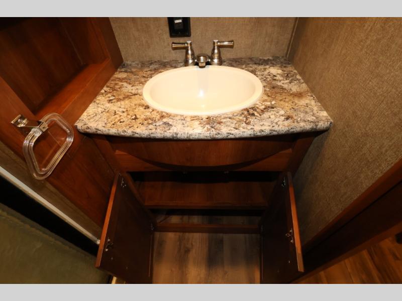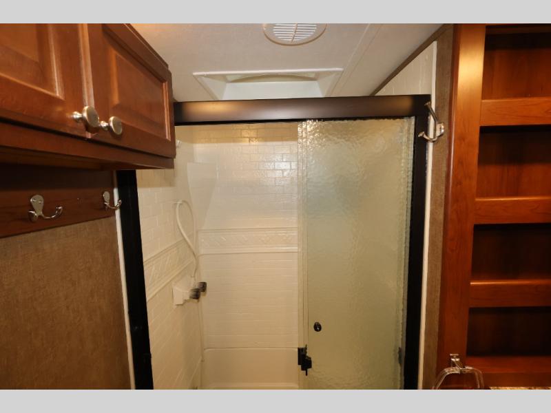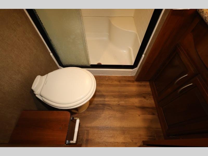 Heading toward the front of this model, you will step up a few stairs and find the bathroom on the left. Here there is a toilet, 40" shower, medicine cabinet, and a sink.