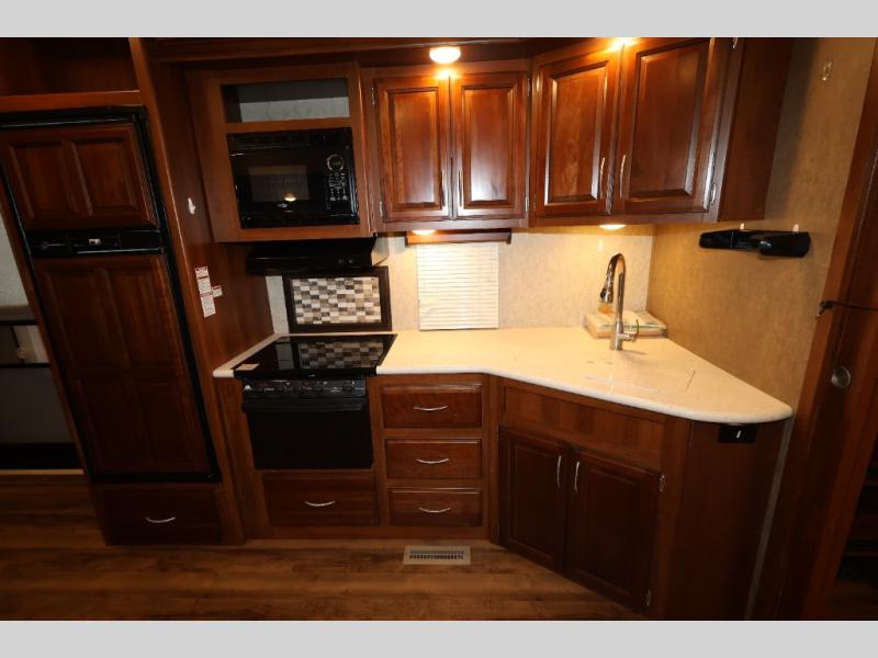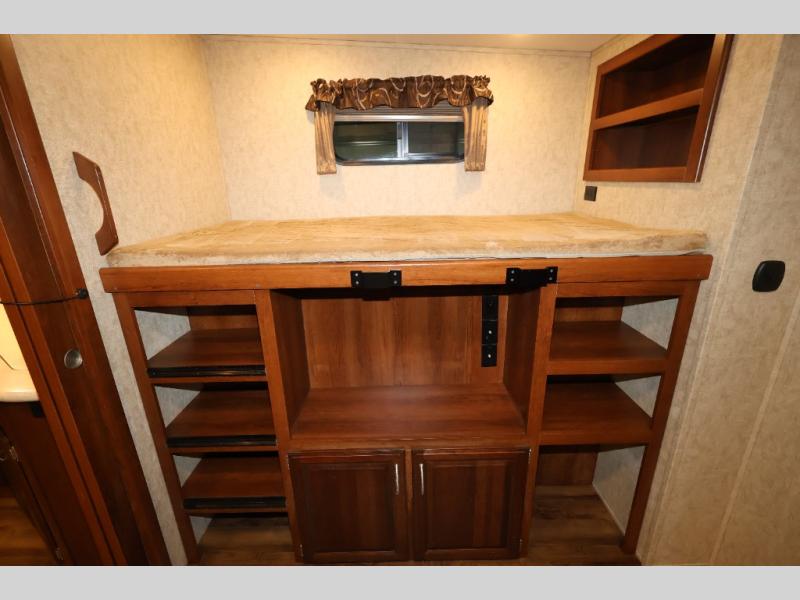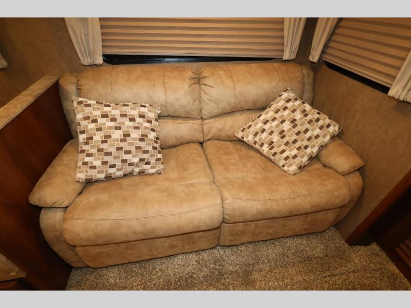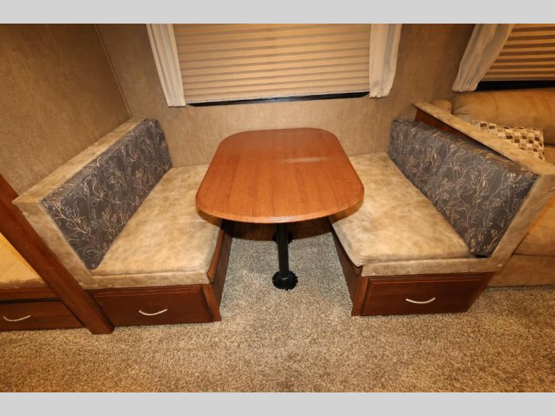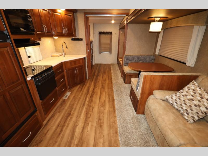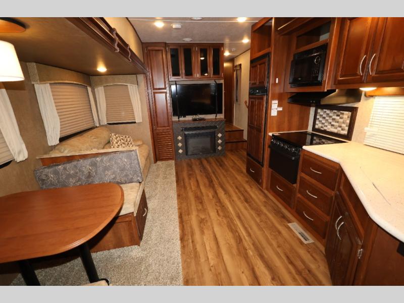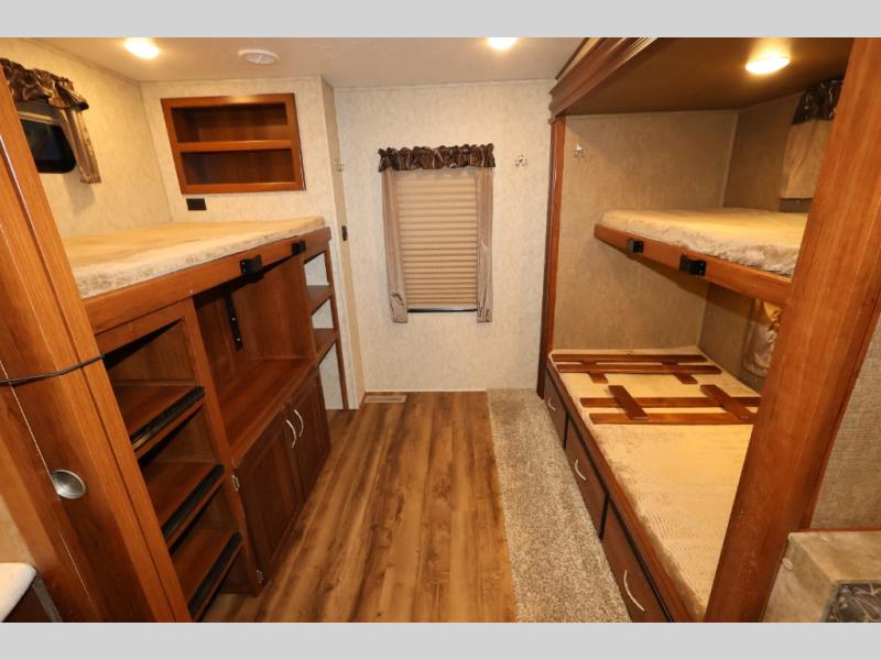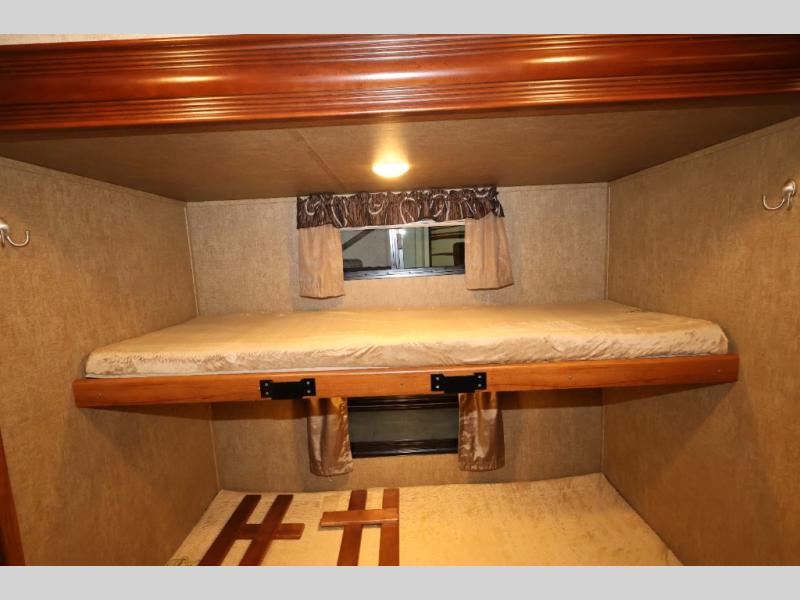 As you enter this model, straight in front of you, along the interior wall there is a 50" LED HDTV for you enjoyment. You can enjoy watch movies or TV in the evening here. To the left of the entry door you will find a corner cabinet, 8 cu. ft. refrigerator, overhead microwave, three burner range, double kitchen sink, and extra counter space. The opposite side of this fifth wheel features a slide out with a hide-a-bed sofa, booth dinette with drawers below, and in the rear bunk house the slide out continues with a set of bunk beds and drawers.