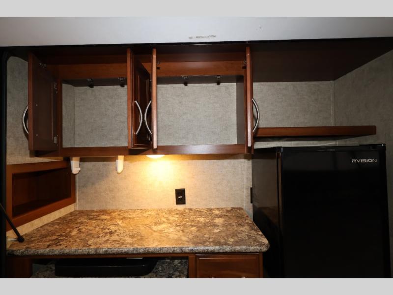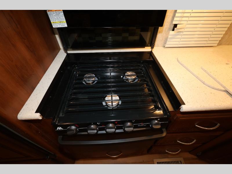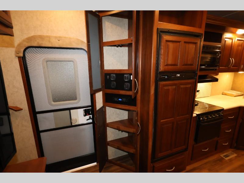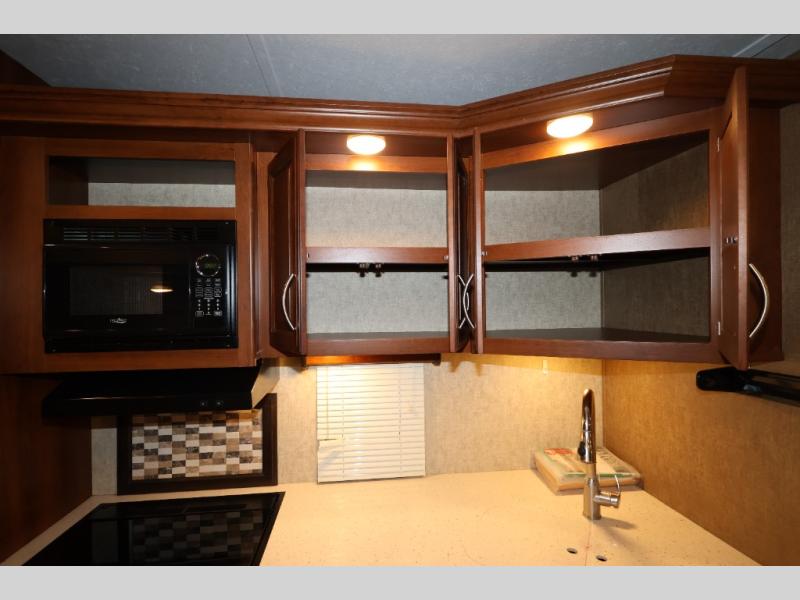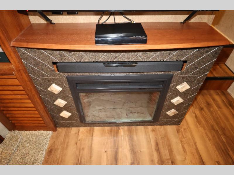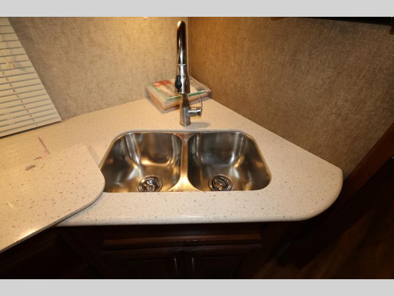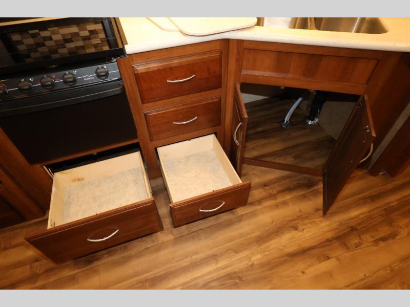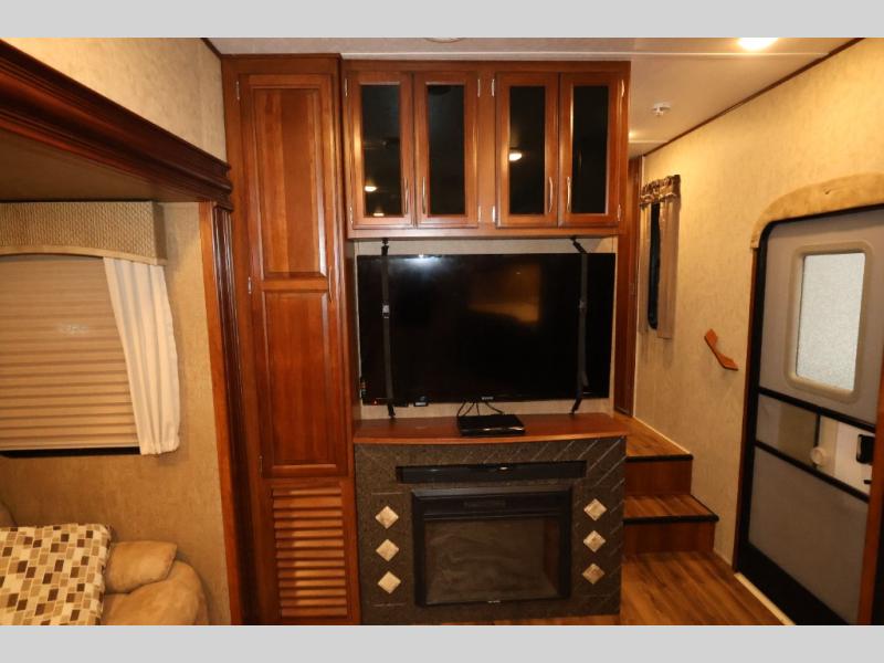 As you enter this model, straight in front of you, along the interior wall there is a 50" LED HDTV for you enjoyment. You can enjoy watch movies or TV in the evening here. To the left of the entry door you will find a corner cabinet, 8 cu. ft. refrigerator, overhead microwave, three burner range, double kitchen sink, and extra counter space. The opposite side of this fifth wheel features a slide out with a hide-a-bed sofa, booth dinette with drawers below, and in the rear bunk house the slide out continues with a set of bunk beds and drawers.