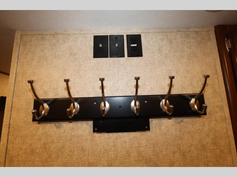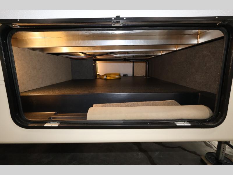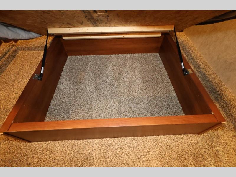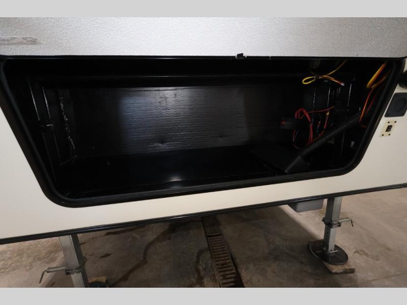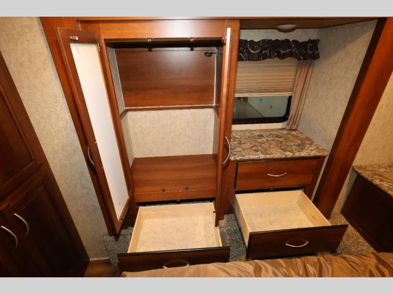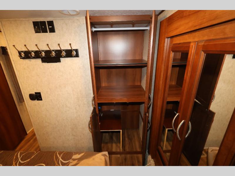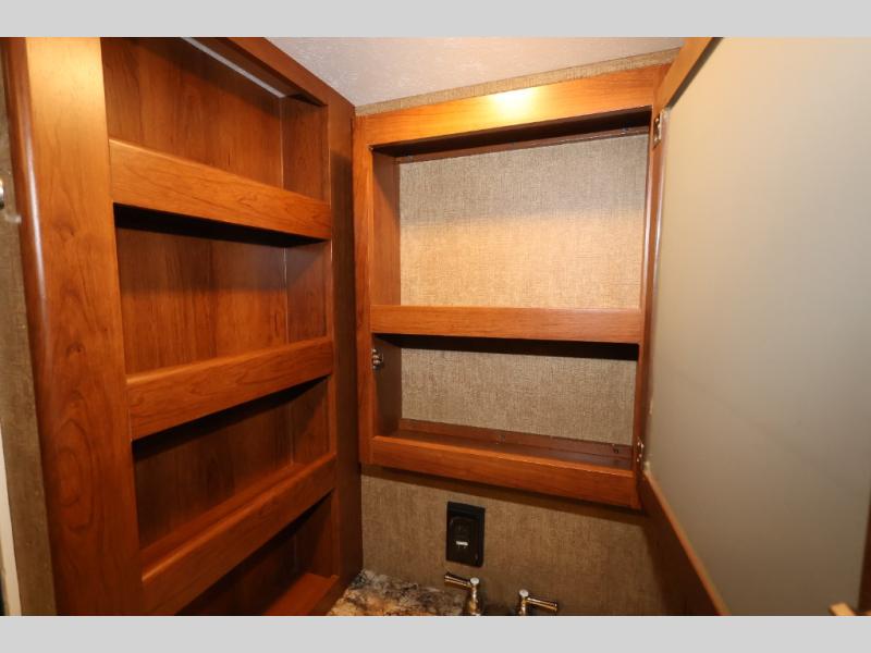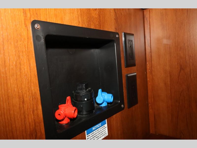 In the front bedroom you will find a queen bed with a Denver mattress, two nightstands, and along one wall there is a slide out with a desk and drawers, and a wardrobe with hanging rod. Also in the bedroom there is an area that has been washer/dryer prepped which is super convenient if you choose to add the washer/dryer, now you can do your laundry as you camp and you won't have a bunch of dirty clothes to bring home with you.