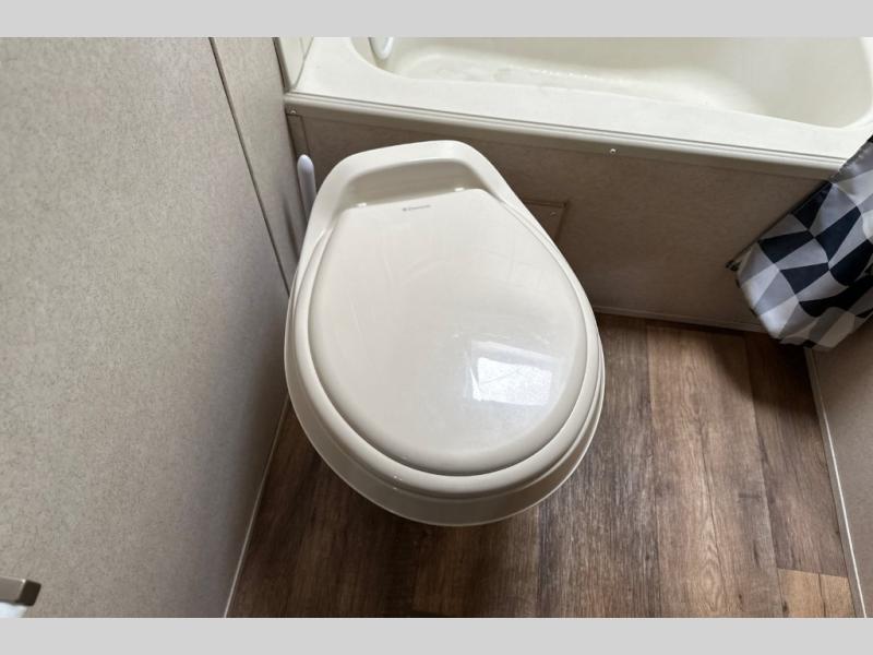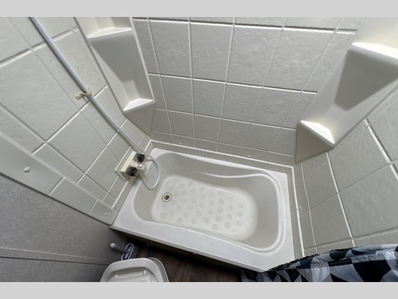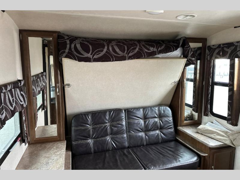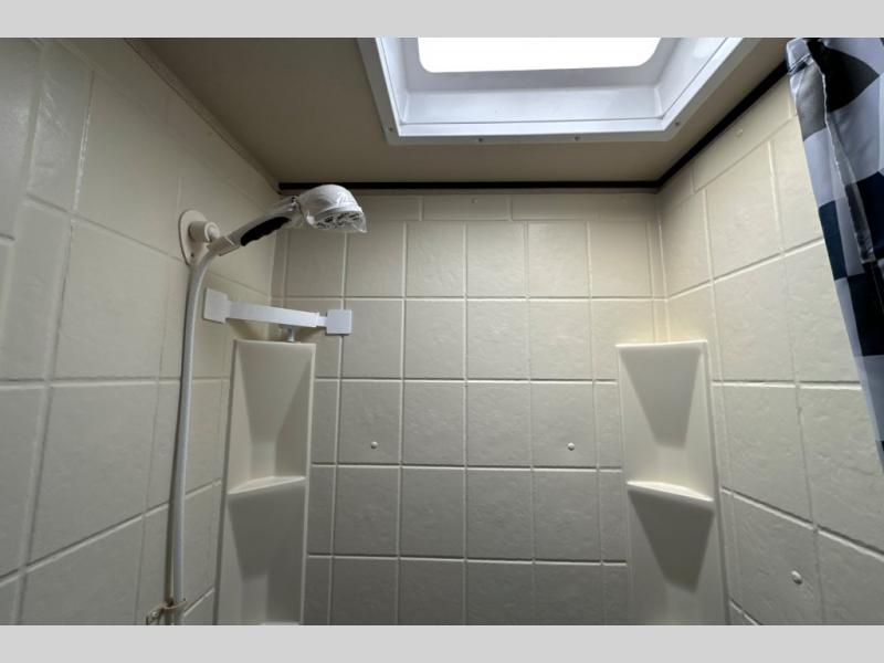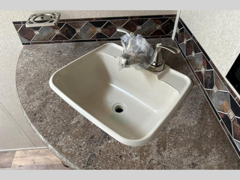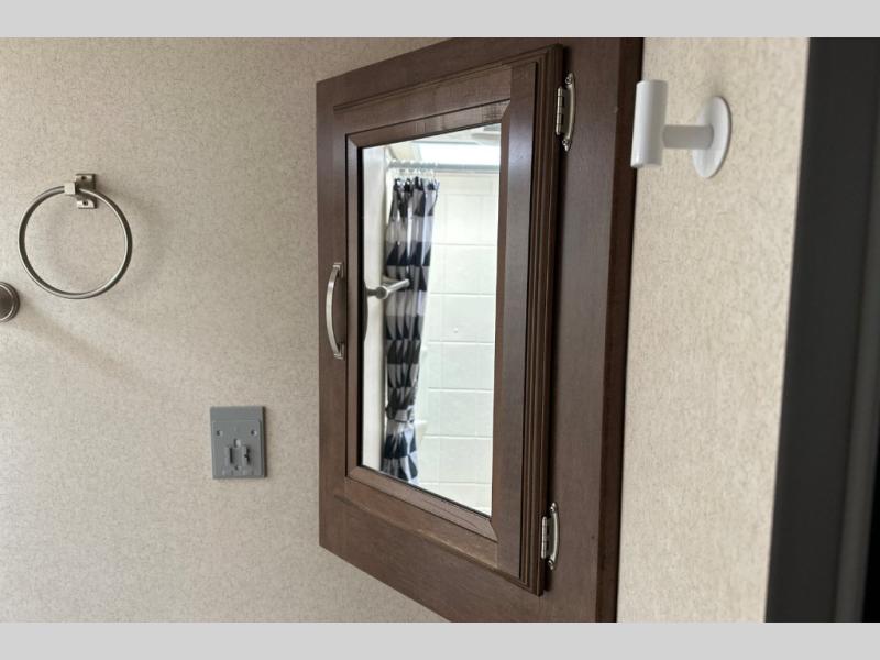 In the very rear of this Salem Hemisphere Hyper-Lyte model you can sleep four adults with the double bed bunks along the curb side. Right next door you have a convenient full bath with tub, toilet, and corner vanity with sink plus overhead medicine cabinet.