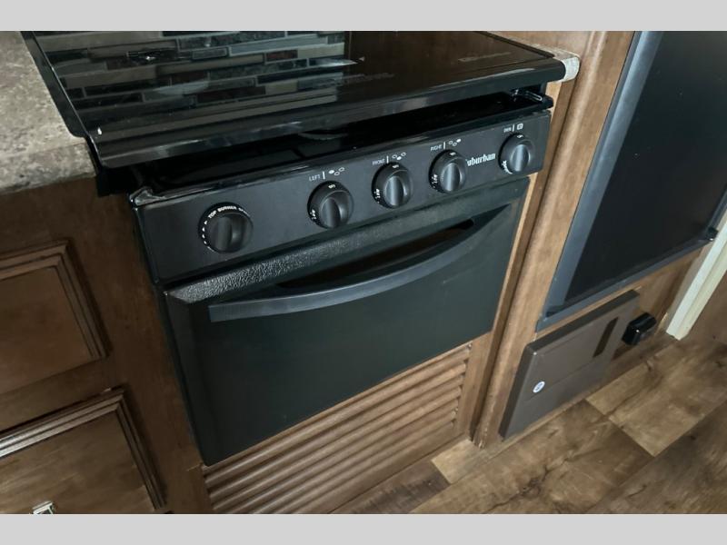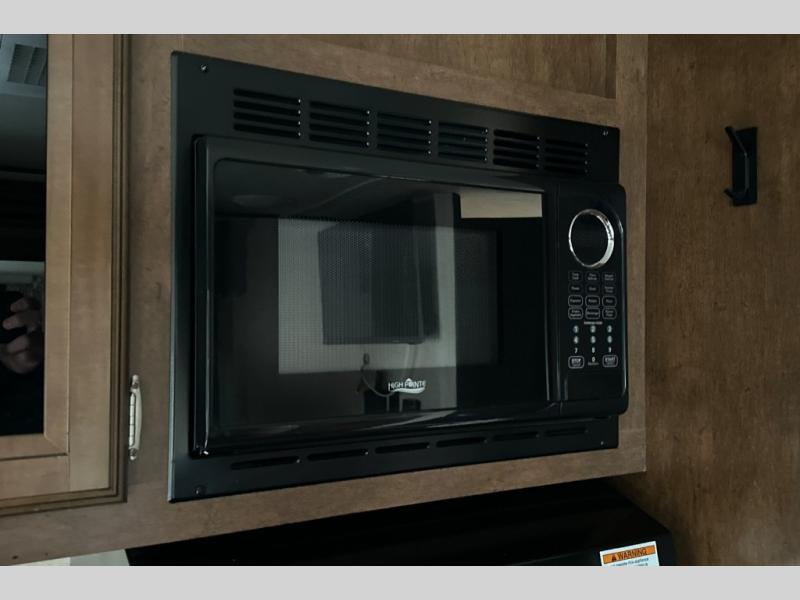 The kitchen is on the opposite wall to the left of the entry door. Here you will easily be able to create light meals and snacks for your whole crew. There is an L-shaped counter with double sinks, a trash location, three burner range with overhead microwave oven, and a refrigerator. You will also find plenty of overhead storage and counter space too. A nice food pantry is located just off the slide out dinette for dry and canned goods.
