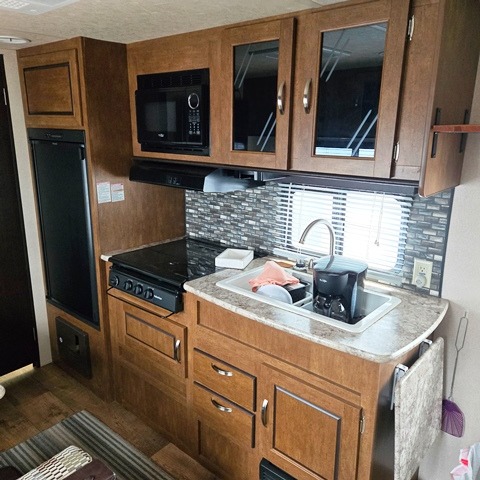To the left of the entry door you will find a booth dinette with an entertainment center along the rear most side, plus overhead cabinets the length of the dinette. Opposite you can enjoy cooking your meals and snacks in the kitchen area which offers a refrigerator, a three burner range with overhead microwave oven, and a double sink with storage above. There is also a fold-up counter-top if you need a bit more work space.