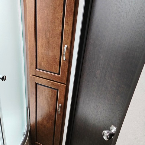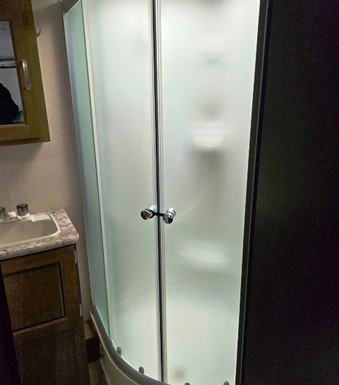 The very rear provides a convenient full bath with radius shower, toilet, vanity with sink, plus wardrobe and overhead medicine cabinet.