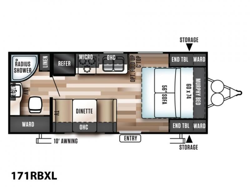 Step inside model 171RBXL and notice the space up front with a 68" sofa including end tables during the day. At night turn down the Murphy bed and enjoy a queen size bed with wardrobes on both sides in the same space.
