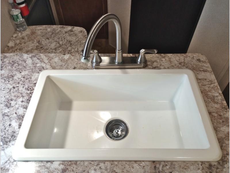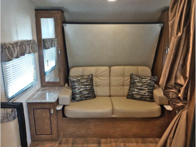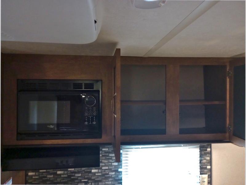There is a 56" sofa across the front area of this Wildwood X-Lite model that also features two end tables. You can comfortably enjoy the entertainment center just off the u-shaped dinette slide. When night falls and you are ready for bed you can open up the Murphy bed behind the sofa and sleep comfortable with storage on either side.