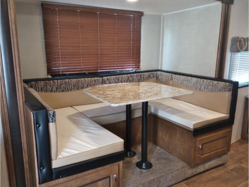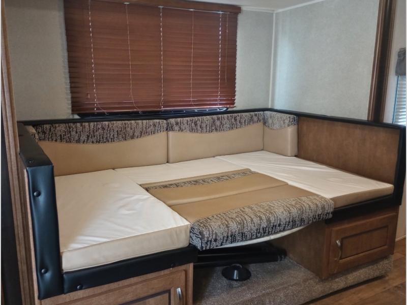 To the right of the entry door there is a cabinet with counter-top space, and the kitchen area. Here you will find an L-shaped counter with double sinks, a three burner range with overhead microwave oven, and a refrigerator for your perishables. Opposite enjoy dining at the slide out u-shaped dinette. This can easily be transformed into added sleeping space when needed at night.