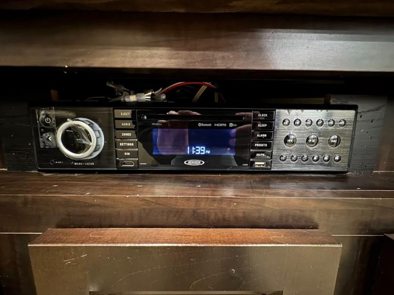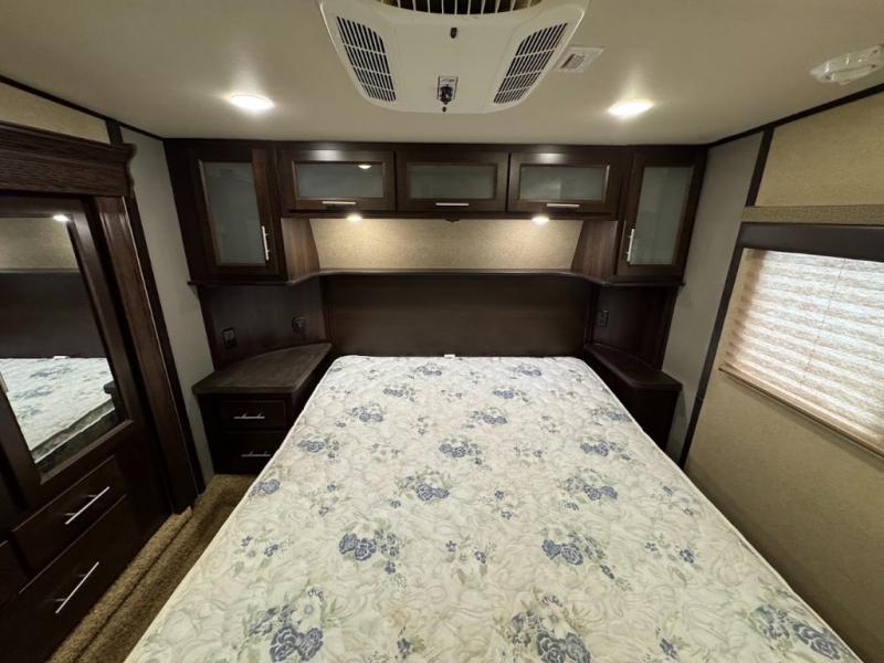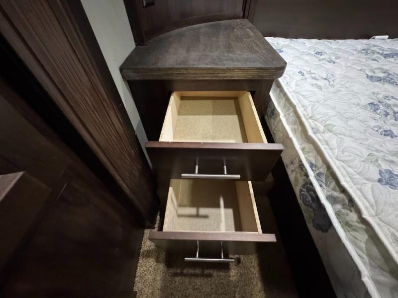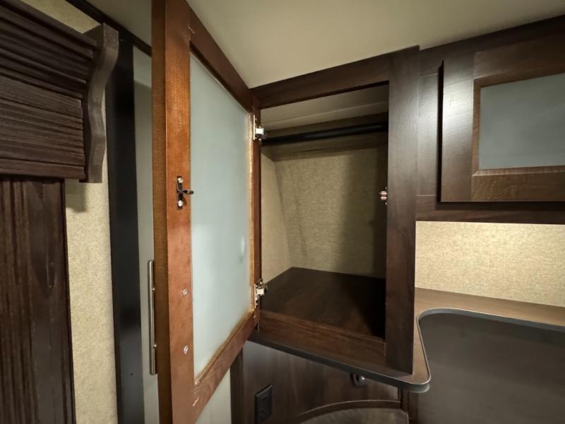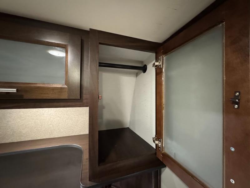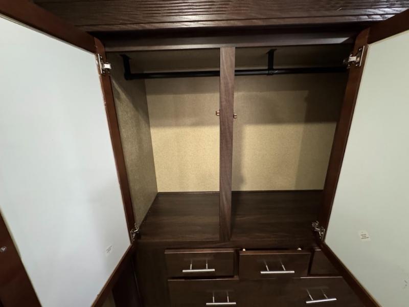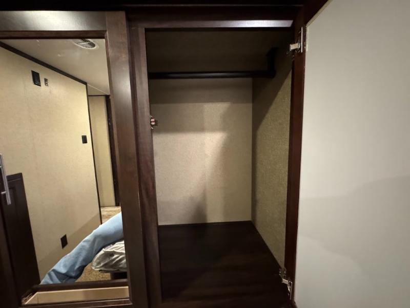 The front bedroom has a king bed, two nightstands, and an overhead cabinet. You will also find a wardrobe slide out for all of your hanging clothes, plus along one wall there is a TV for your enjoyment.