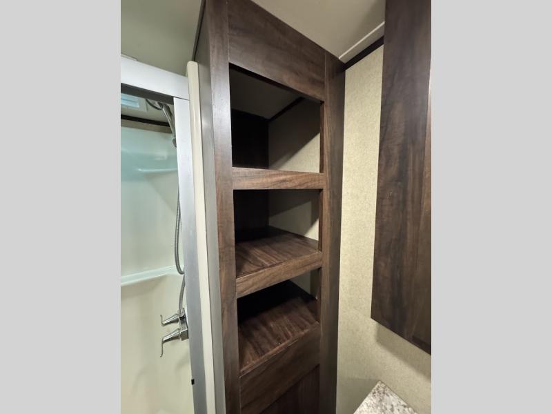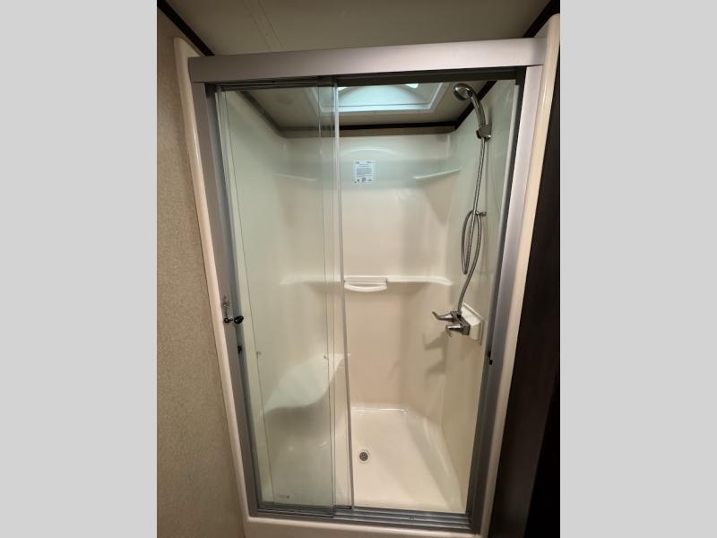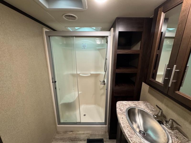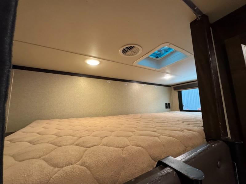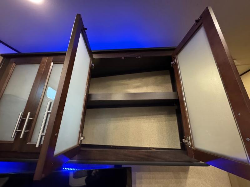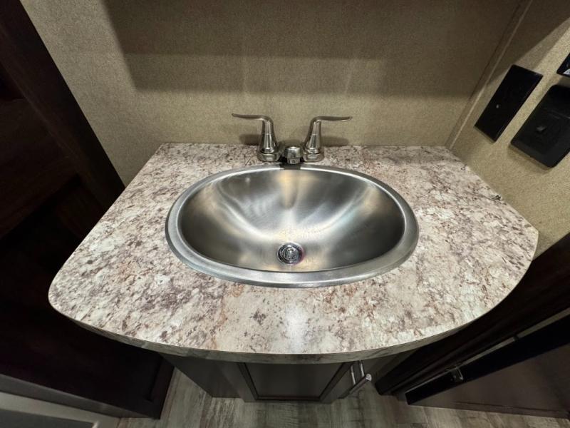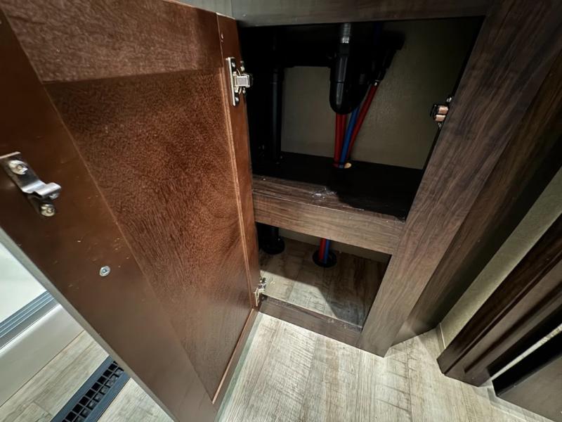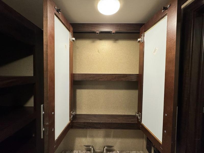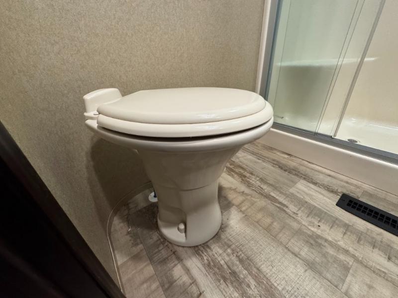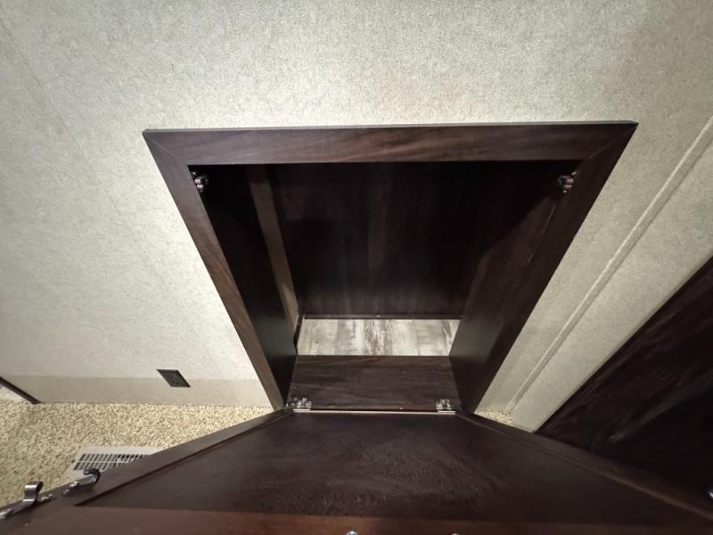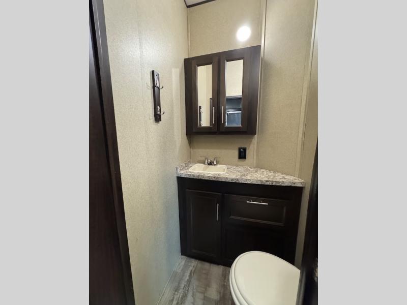 In the cargo area find an optional electric bed and pass-through dinette. Both of these add additional sleeping space at night, and when the electric bed is not in use, it can easily be stored near the ceiling to provide more room in the cargo area. The loft is a spot your kids may enjoy. Also find the cargo area TV and washer/dryer prep for your convenience. There is also a half bath with a toilet, and sink.