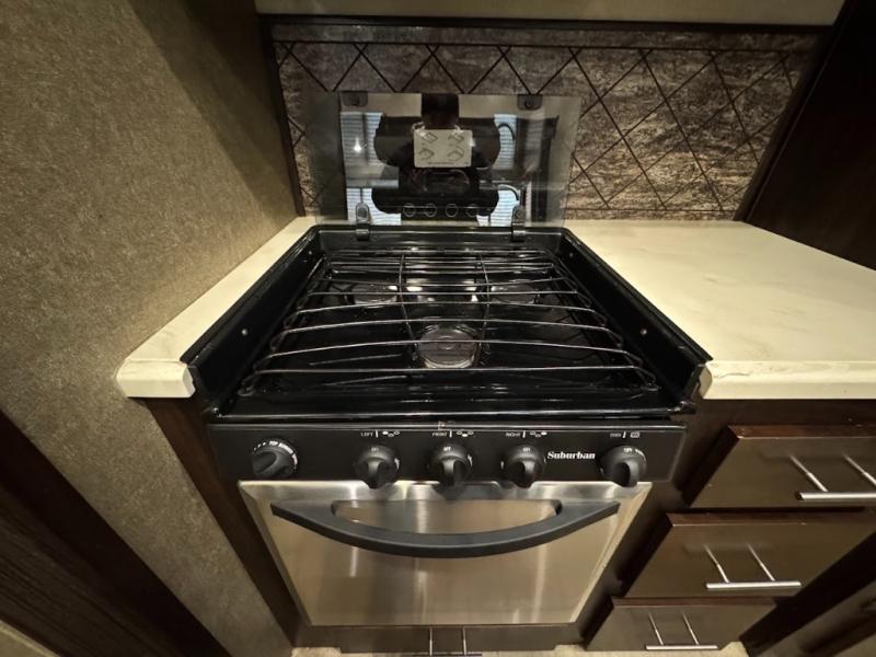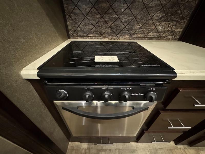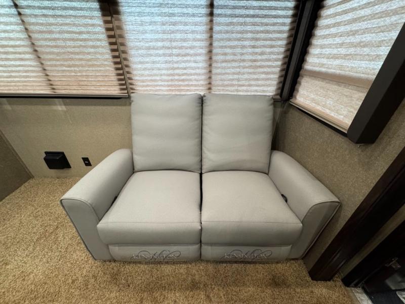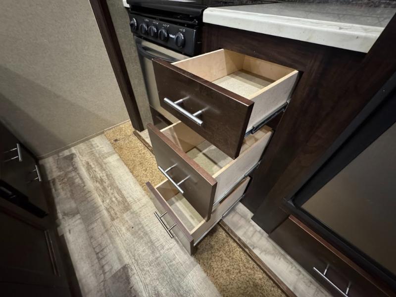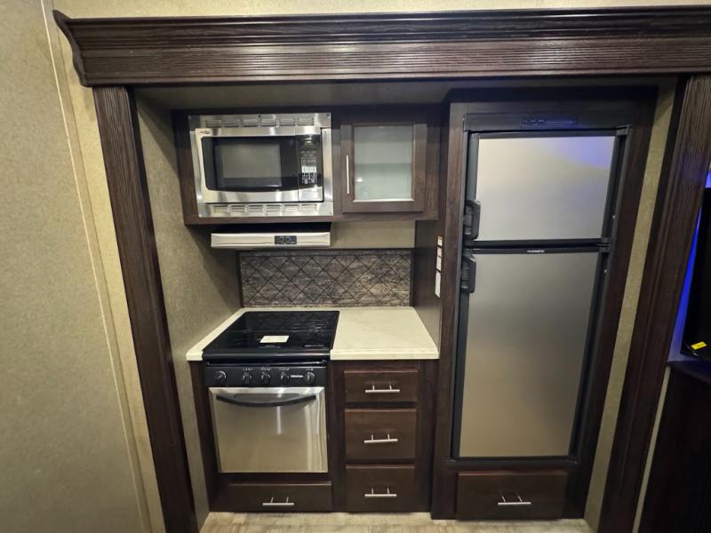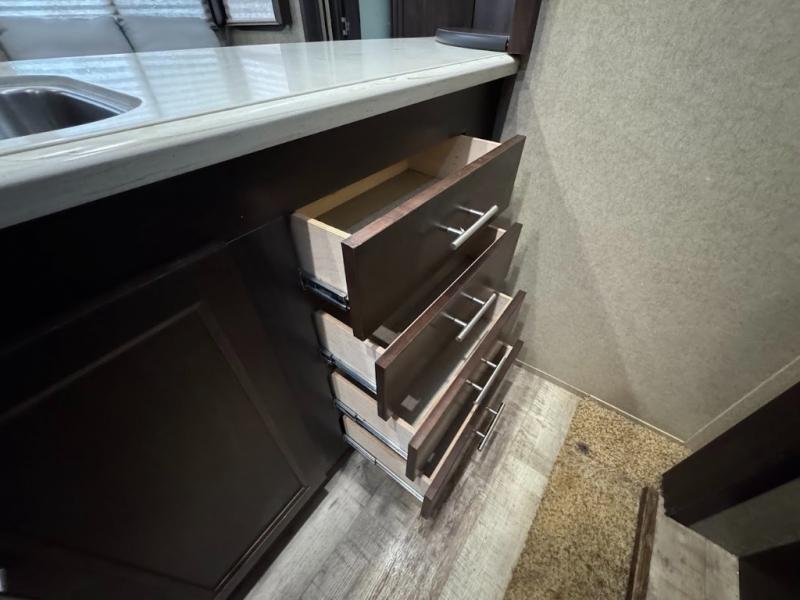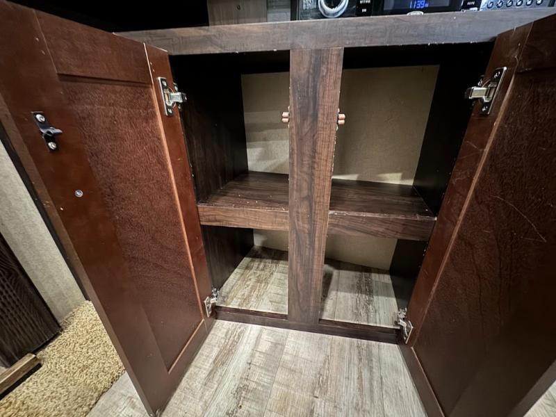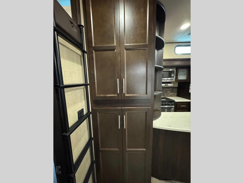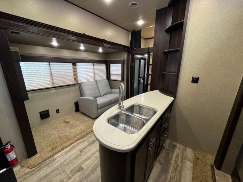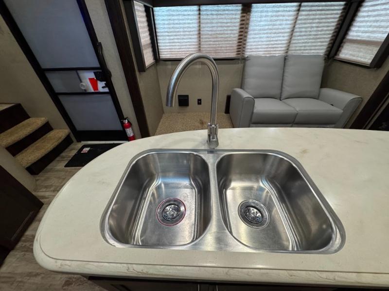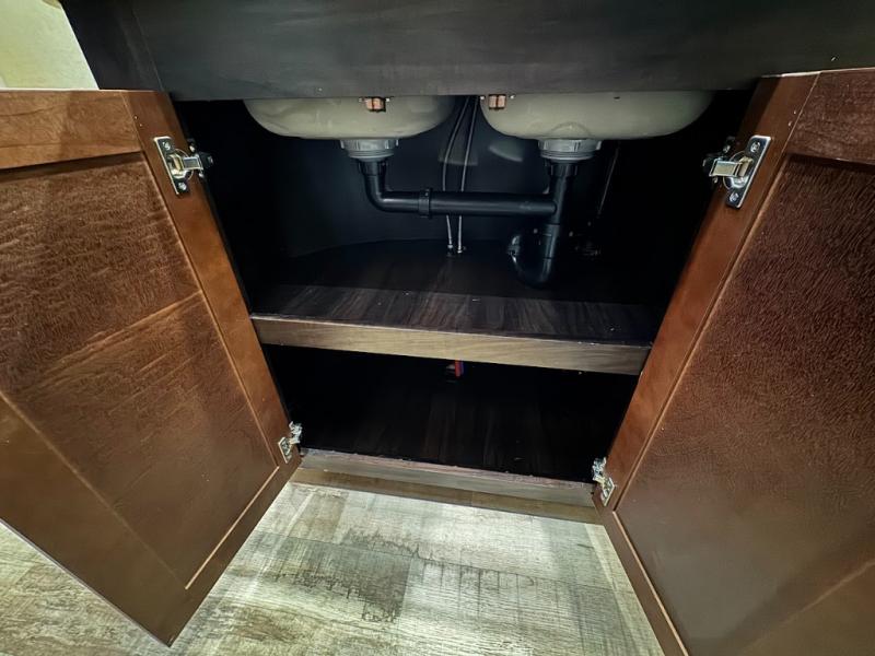 Enter into the main living area and here you will find dual opposing slide outs. The first slide has a reclining sofa. Across from the sofa find a large pantry for your canned goods. In the kitchen area there is a counter peninsula with a double kitchen sink. Behind the sink there is a slide out with a three burner range, overhead cabinet, and refrigerator. Adjacent to the slide find a large entertainment center.