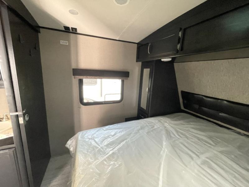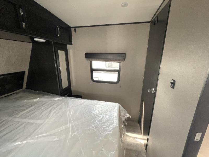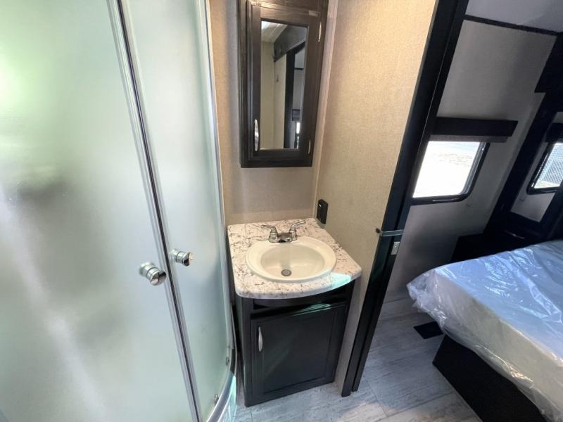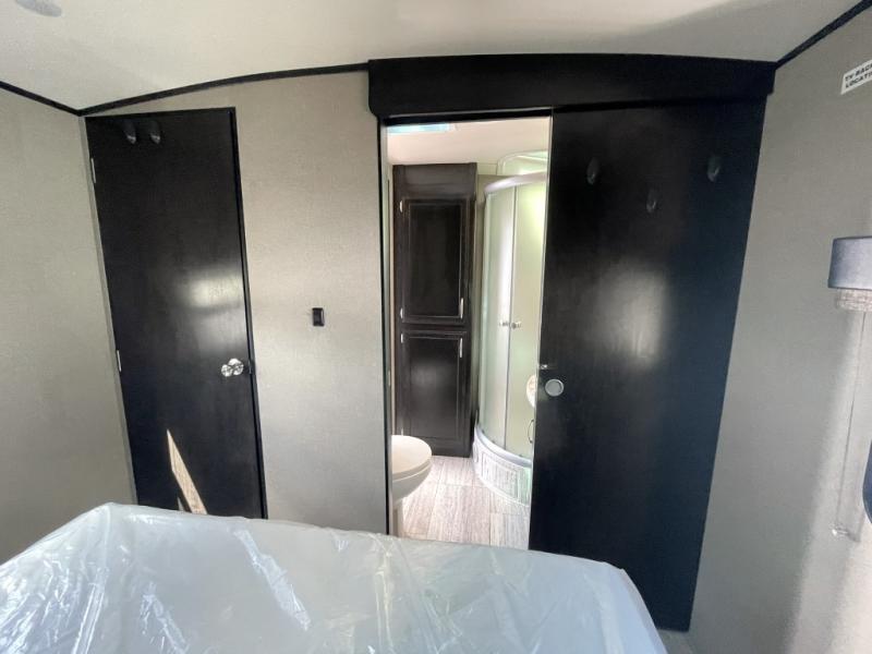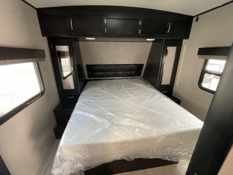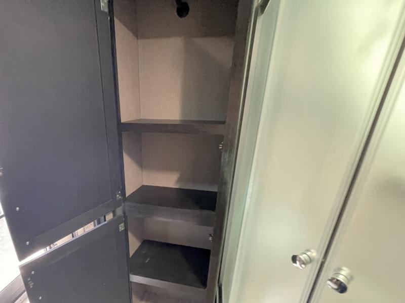 At the front of the trailer, the master bedroom offers a peaceful retreat with a queen-size bed, dual wardrobes, overhead cabinets, and a private sliding door for added privacy. Whether you’re winding down for the night or sneaking in a mid-day nap, this space is made for relaxation.